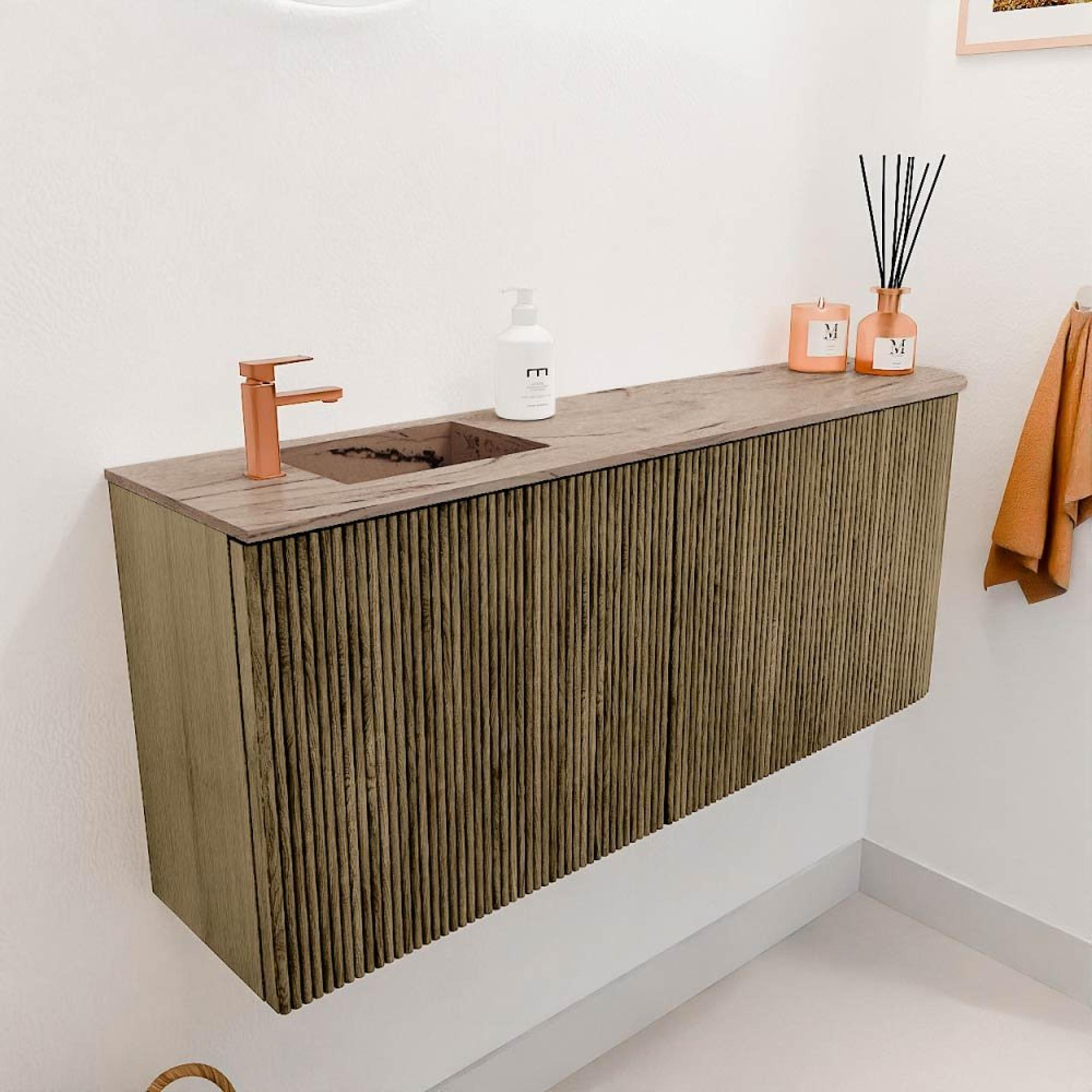De combinatie van massief eikenhout aan de voorkant en eikenfineer aan de zijkanten in de warme kleur Dusk geeft dit meubel een natuurlijke en tijdloze uitstraling. De afgeronde rechterkant zorgt voor een uniek design dat direct in het oog springt. Dit meubel past perfect in zowel moderne als klassieke badkamers, waardoor je jarenlang kunt genieten van een stijlvolle en harmonieuze sfeer. Door de subtiele kleurtonen en het hoogwaardige materiaalgebruik voelt het meubel luxe aan zonder te overheersen. Zo voeg je moeiteloos een elegant statement toe aan jouw badkamerinterieur.