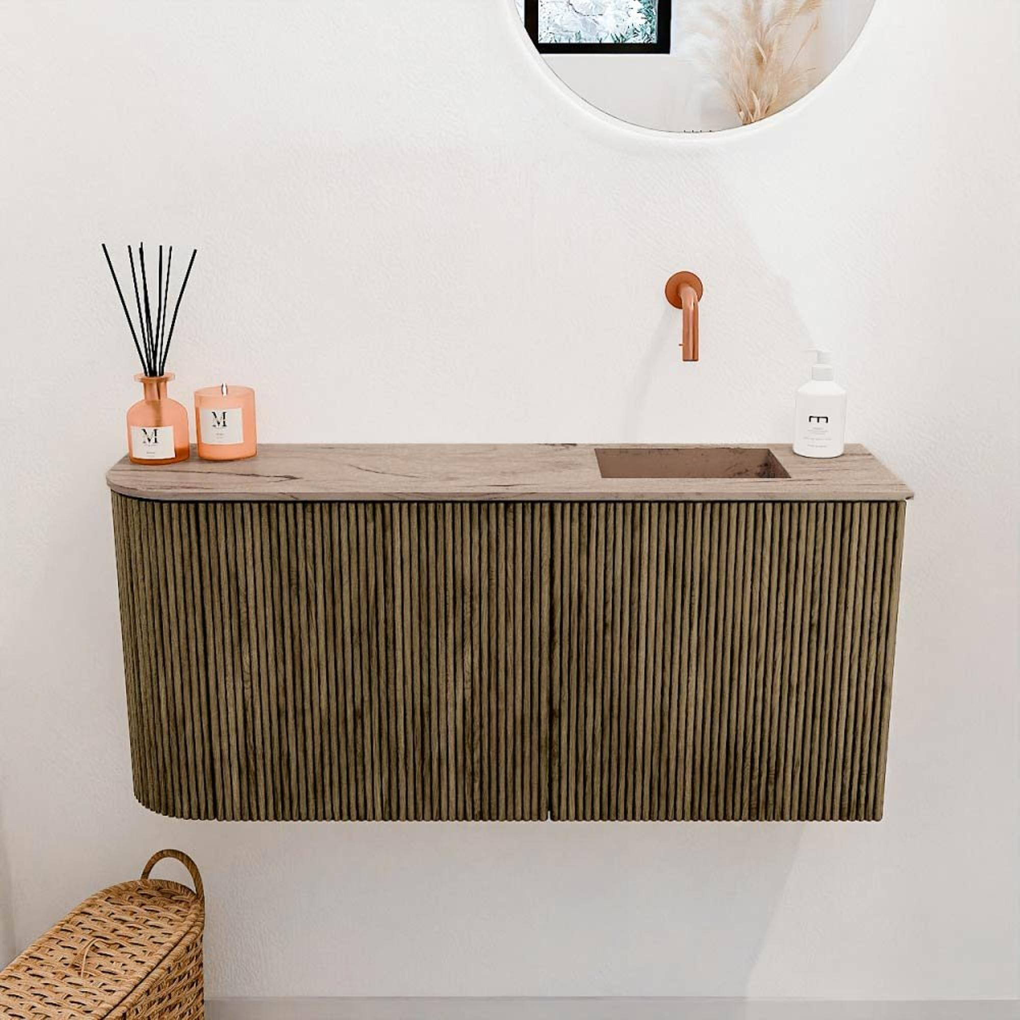 - Wastafel Faye in kleur Arena, rechts gepositioneerd zonder kraangat – maximale flexibiliteit