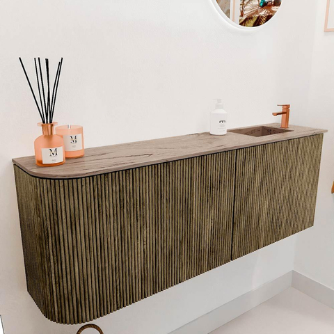 Met zijn moderne ronding aan de linkerkant en de verfijnde kleur Dusk is dit meubel een echte blikvanger. De combinatie met de wastafel in de warme Arena tint geeft jouw badkamer een luxe uitstraling zonder te overheersen. Dit meubel past perfect in zowel strakke als meer klassieke interieurs en voegt direct sfeer toe. Door het subtiele design voelt de ruimte groter en lichter aan, wat bijdraagt aan een prettige badkamerbeleving. Kies voor een meubel dat niet alleen functioneel is, maar ook jouw persoonlijke stijl weerspiegelt.
