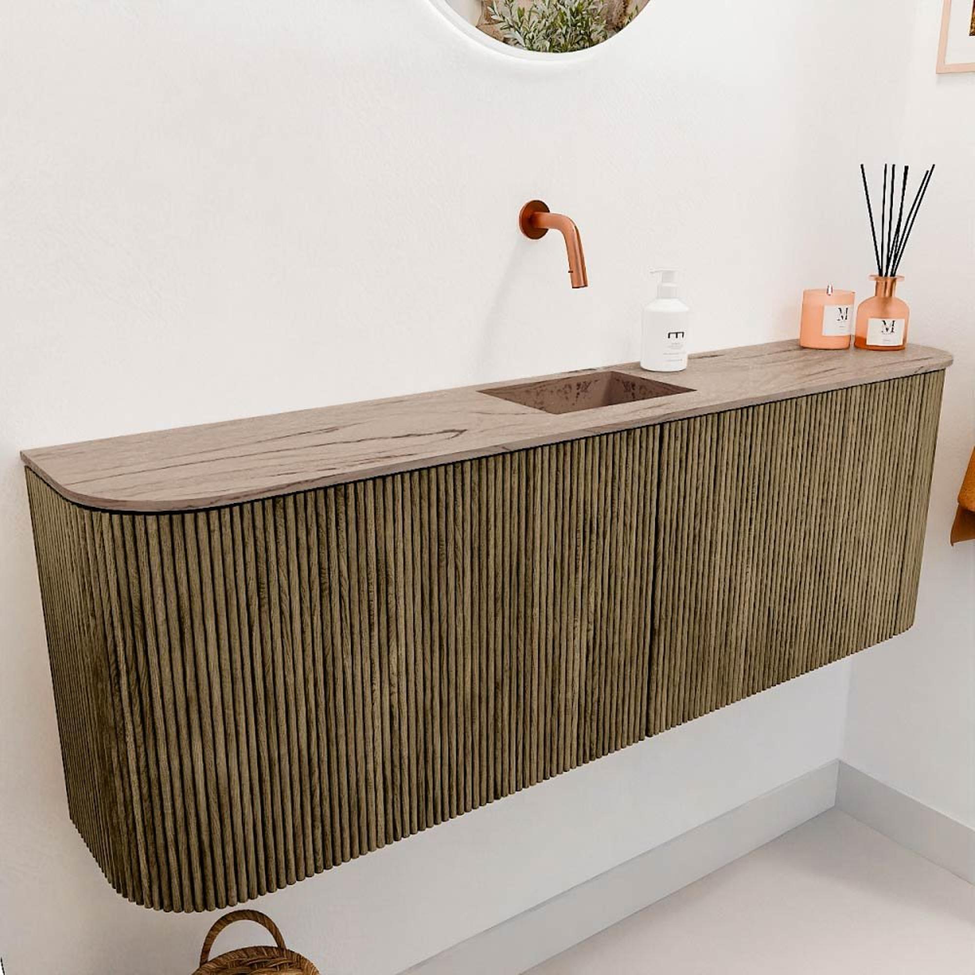De combinatie van massief eikenhout en eikenfineer in de kleur Dusk geeft dit meubel een tijdloze en natuurlijke uitstraling. De afgeronde hoeken aan beide zijden zorgen voor een zacht en elegant design dat zich moeiteloos aanpast aan verschillende interieurstijlen. Of je nu een moderne, landelijke of minimalistische badkamer hebt, dit meubel voegt altijd een vleugje klasse toe. De centrale positie van de wastafel in een lichte Arena-kleur versterkt het stijlvolle contrast en maakt het geheel bijzonder aantrekkelijk. Zo geniet je niet alleen van een functioneel meubel, maar ook van een echte eyecatcher die jouw badkamer een upgrade geeft.