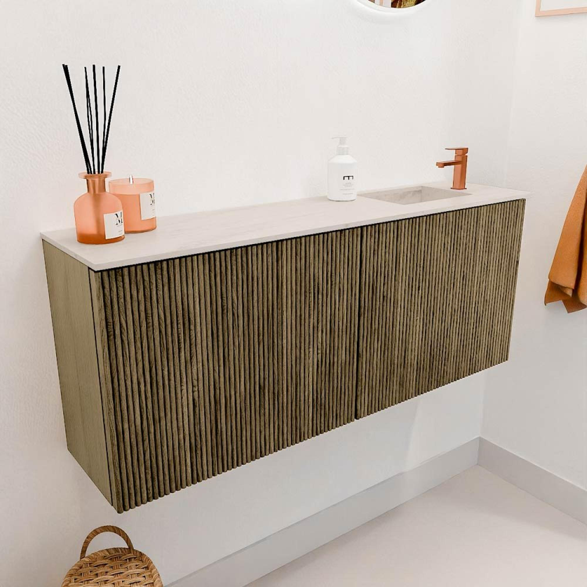De combinatie van de kleur Dusk met de Meli wastafel geeft dit meubel een unieke en verfijnde uitstraling. De verticale groeven voegen een speels maar strak detail toe, waardoor het meubel een echte blikvanger wordt. Door het gebruik van natuurlijke houttinten straalt het meubel warmte uit, wat zorgt voor een uitnodigende sfeer in je badkamer. Dit stijlvolle ontwerp past perfect bij moderne en tijdloze badkamers en voegt direct karakter toe zonder te overheersen.