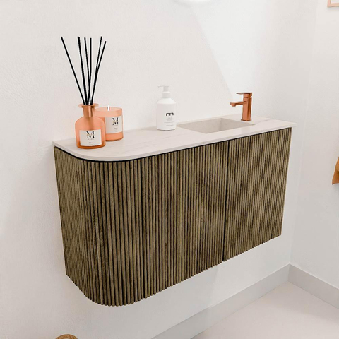 De warme kleur Dusk gecombineerd met de natuurlijke uitstraling van massief eikenhout aan de voorkant geeft dit meubel een luxe en authentieke uitstraling. De verticale groeven in het hout zorgen voor een subtiel, maar onderscheidend detail dat het meubel een eigentijdse twist geeft. Deze stijlvolle elementen maken het meubel niet alleen een functioneel onderdeel van je badkamer, maar ook een echte eyecatcher. Zo voeg je moeiteloos sfeer en karakter toe aan je ruimte, wat bijdraagt aan een prettige en uitnodigende badkameromgeving.