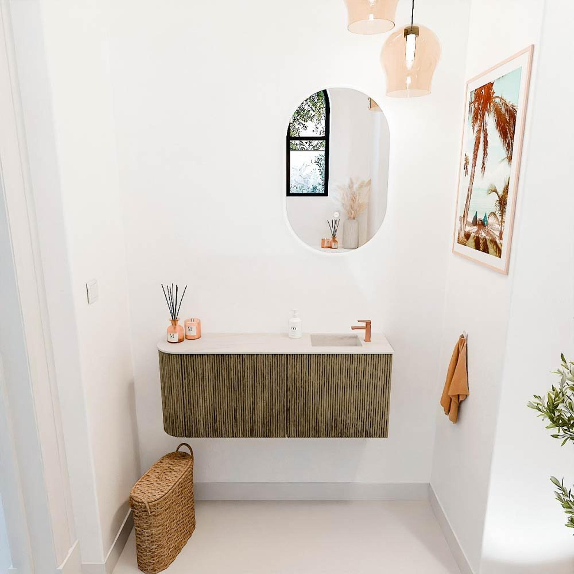 - Kleur Dusk voor het meubel en Meli voor de wastafel – warme en rustige tinten
