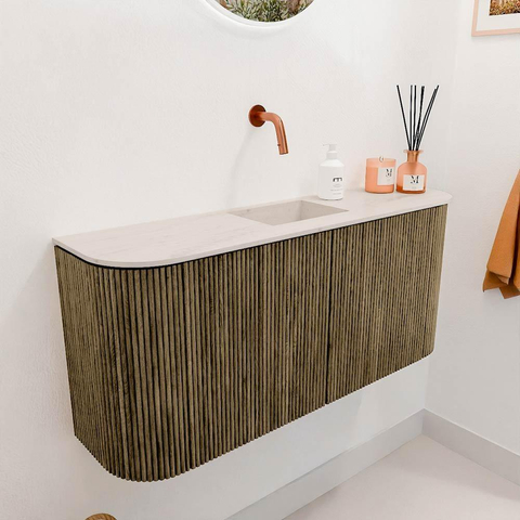 Dit meubel straalt pure elegantie uit door het gebruik van natuurlijke houtsoorten en een verfijnde afwerking in de kleur Dusk. De verticale ribbelstructuur geeft het geheel een uniek karakter, terwijl de afgeronde hoeken zorgen voor een zachte, harmonieuze uitstraling. Hierdoor past het meubel moeiteloos in zowel moderne als klassieke badkamers. Met dit design kies je voor een tijdloze look die nooit uit de mode raakt en die jouw badkamer een luxe en uitnodigende sfeer geeft.
