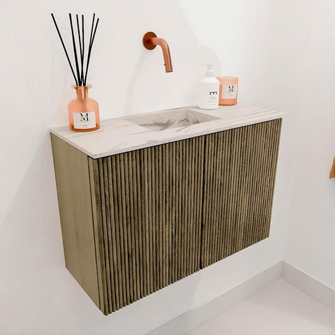 Het meubel valt meteen op door zijn tijdloze en natuurlijke uitstraling. Het massief eikenhout in de warme Dusk-kleur geeft een luxe en authentieke sfeer, terwijl de verticale groeven subtiel voor extra diepte en karakter zorgen. De combinatie met de strakke wastafel in een zachte Nata-kleur maakt het geheel bijzonder stijlvol en modern. Zo voeg je een uniek element toe aan je badkamer dat moeiteloos aansluit bij diverse interieurstijlen, van landelijk tot eigentijds. Dankzij het doordachte ontwerp zonder afgeronde hoeken oogt het meubel extra strak en verzorgd.