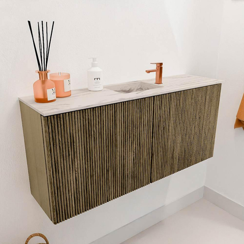 Het meubel valt direct op door zijn tijdloze en verfijnde design. De kleur Dusk geeft een warme, natuurlijke uitstraling die moeiteloos aansluit bij diverse interieurstijlen. De verticale groeven voegen een subtiel detail toe dat het meubel karakter en diepte geeft. Dit maakt het niet alleen een functioneel element, maar ook een echte blikvanger in je badkamer. Door het minimalistische ontwerp en de strakke lijnen creëer je een rustige en overzichtelijke ruimte, wat bijdraagt aan een ontspannen sfeer. Zo geniet je niet alleen van een praktisch meubel, maar ook van een stijlvolle toevoeging die jouw badkamer compleet maakt.