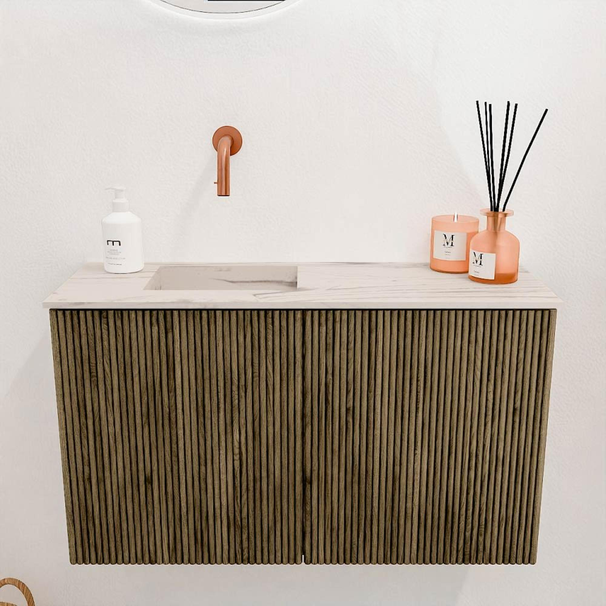 Deze compacte en stijlvolle oplossing brengt direct sfeer en functionaliteit in jouw badkamer of gastentoilet. Met een breedte van 70 cm past dit meubel perfect in kleinere ruimtes, zonder in te leveren op opbergruimte of uitstraling. De warme kleur Dusk en het natuurlijke karakter van het hout zorgen voor een rustgevende en uitnodigende ambiance. De wastafel, subtiel geplaatst aan de linkerkant, biedt voldoende ruimte om je dagelijkse rituelen comfortabel uit te voeren. Dankzij het ontbreken van een kraangat kun je zelf bepalen welke kraan het beste bij jouw stijl en wensen past. Dit meubel is niet alleen een praktische toevoeging, maar ook een echte blikvanger die jouw badkamer een moderne en natuurlijke uitstraling geeft.