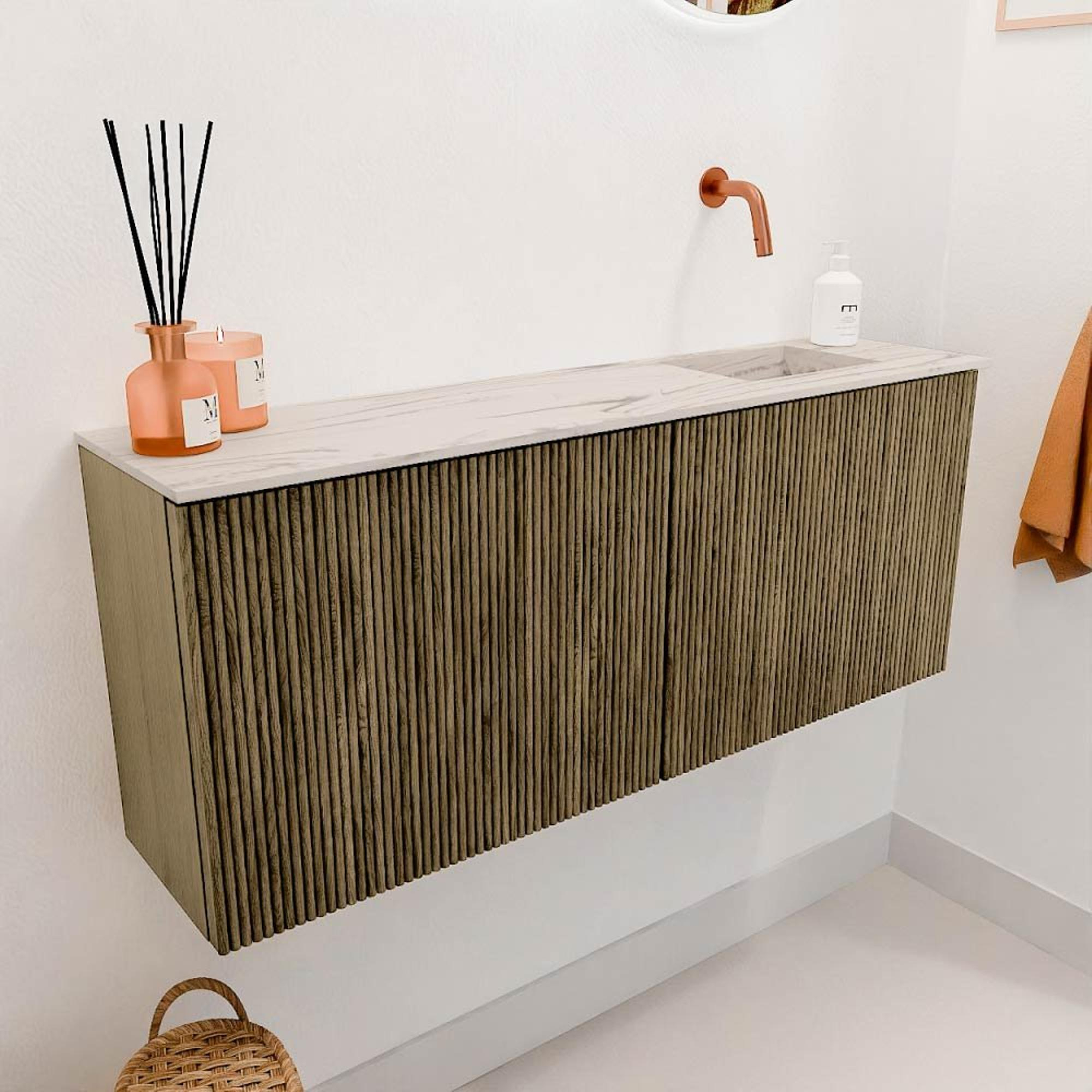 Met een breedte van 100 cm en een diepte van 24,5 cm is dit meubel ideaal voor kleinere badkamers of gastentoiletten waar ruimte beperkt is. De wastafel is rechts gepositioneerd, wat zorgt voor een praktische indeling en voldoende werkruimte naast het wasbakje. Het meubel is wandgemonteerd, waardoor de vloer vrij blijft en schoonmaken eenvoudig wordt. Bovendien is de wastafel zonder kraangat, zodat je zelf de kraan kunt kiezen die het beste bij jouw stijl en wensen past. Dit maakt het meubel flexibel en perfect aan te passen aan jouw persoonlijke badkamerinrichting.