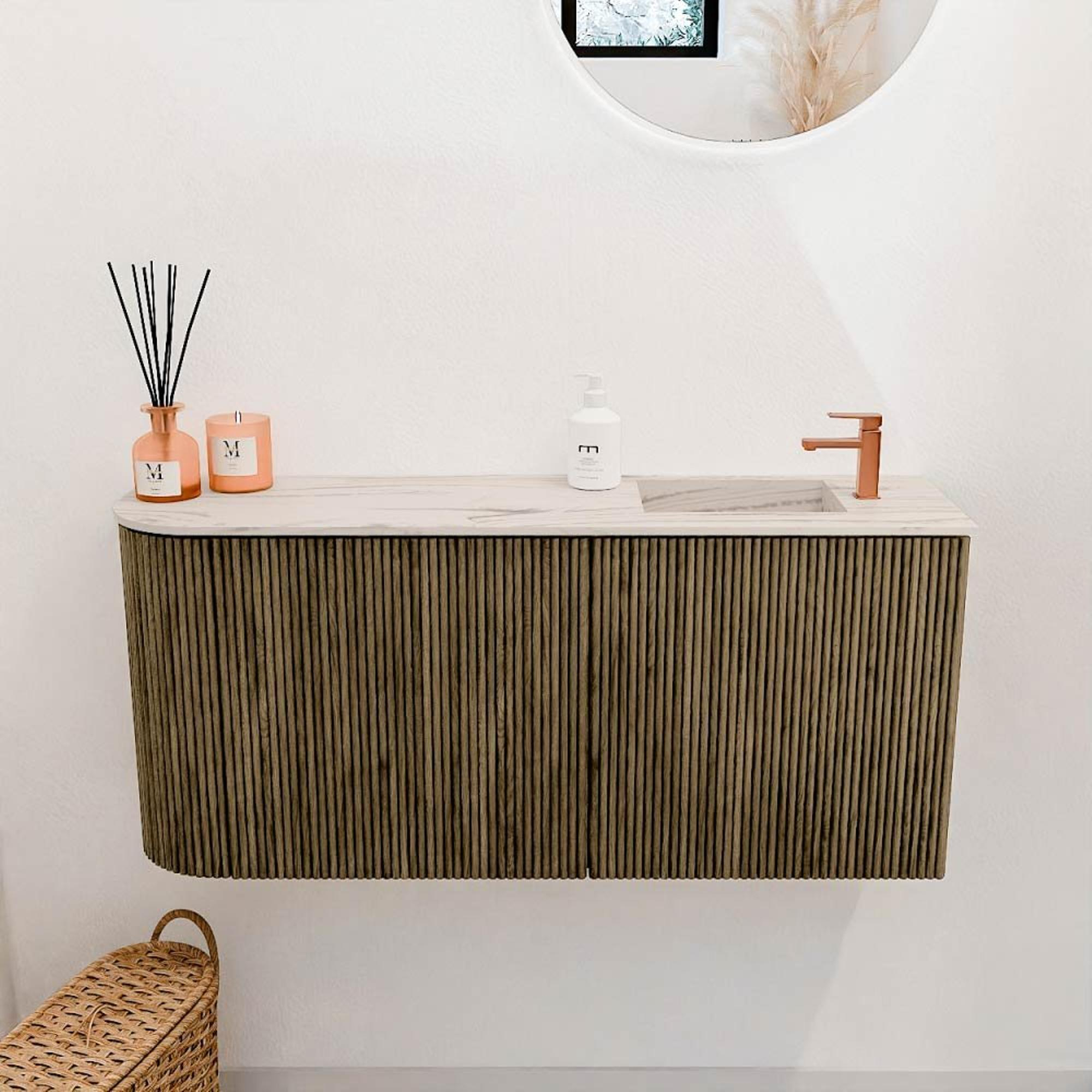 De combinatie van massief eikenhout met eikenfineer en de verticale ribbels geven dit meubel een tijdloze en elegante uitstraling. De kleur Dusk voegt een warme, natuurlijke tint toe die moeiteloos past in diverse badkamerstijlen. Dit meubel is ontworpen om een statement te maken zonder te overheersen, waardoor het een perfecte balans biedt tussen modern design en klassieke charme. Zo creëer je een badkamer die niet alleen functioneel is, maar ook uitnodigt tot ontspanning en genieten.