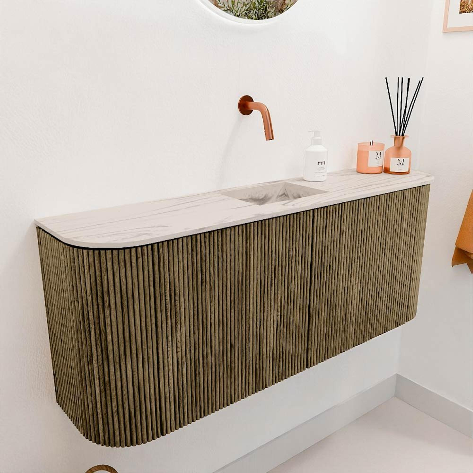 Het meubel valt direct op door zijn moderne en verfijnde design. De afgeronde hoeken aan beide zijden zorgen voor een zachte, elegante uitstraling die je badkamer een luxe gevoel geeft. De kleur Dusk is diep en warm, wat een sfeervolle basis creëert die makkelijk te combineren is met verschillende badkamerstijlen. De wastafel in Nata-kleur vormt een subtiel contrast en zorgt voor een frisse touch. Door deze stijlvolle combinatie krijgt jouw badkamer een unieke uitstraling die tijdloos is en altijd in de mode blijft.