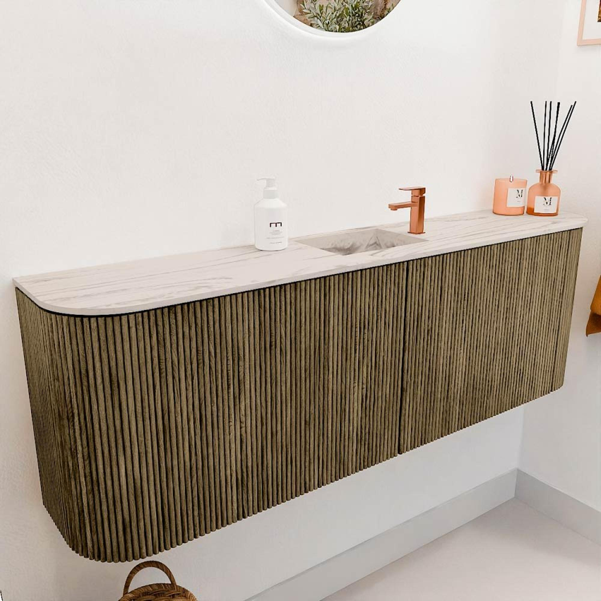 De combinatie van massief eikenhout aan de voorkant en eikenfineer aan de zijkanten geeft dit meubel een natuurlijke en luxe uitstraling. De warme kleur Dusk voegt een subtiele diepte toe, terwijl de ronde vormen zorgen voor een zachte, moderne look. Dit maakt het meubel niet alleen een praktische toevoeging, maar ook een echte blikvanger in je badkamer. Door het tijdloze design past het moeiteloos bij verschillende interieurstijlen, van klassiek tot modern. Zo creëer je een badkamer die niet alleen functioneel is, maar ook uitnodigend en stijlvol.
