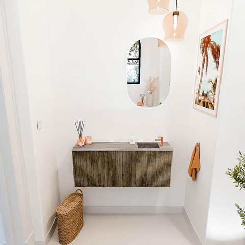 De combinatie van massief eikenhout aan de voorkant en eikenfineer aan de zijkanten zorgt voor een luxe uitstraling die je direct opvalt. De warme kleur Dusk versterkt dit effect en maakt het meubel een tijdloze toevoeging aan je badkamer. Door het strakke, minimalistische design past het moeiteloos bij verschillende stijlen, van modern tot landelijk. Zo creëer je een harmonieuze sfeer waarin je je helemaal thuis voelt. Bovendien zorgt de wandmontage voor een ruimtelijk effect, waardoor zelfs kleinere badkamers groter lijken.