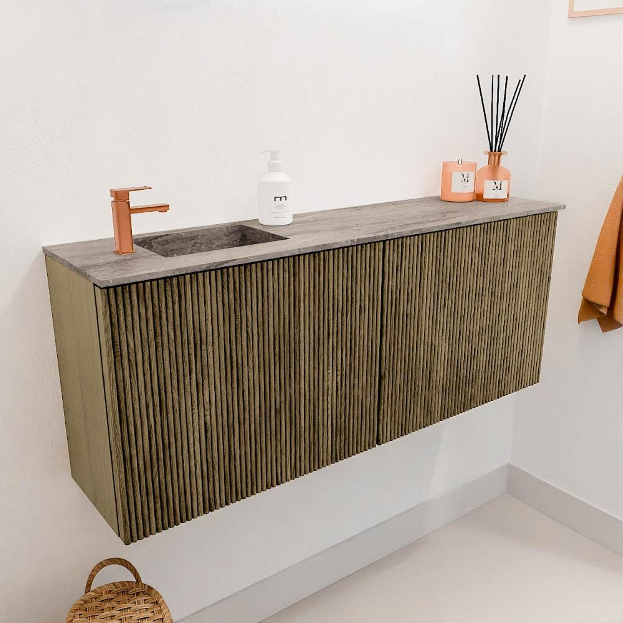 Het meubel valt direct op door zijn strakke lijnen en de verfijnde kleur Dusk, die een rustige en eigentijdse uitstraling geeft. Deze subtiele tint past moeiteloos bij diverse interieurstijlen, van modern tot industrieel. De wastafel in kleur Oza voegt een extra dimensie toe met een zachte, natuurlijke uitstraling. Zo creëer je een samenhangend geheel dat uitnodigt tot ontspanning. Door het minimalistische design oogt de ruimte groter en rustiger, wat bijdraagt aan een aangename badkamerbeleving.