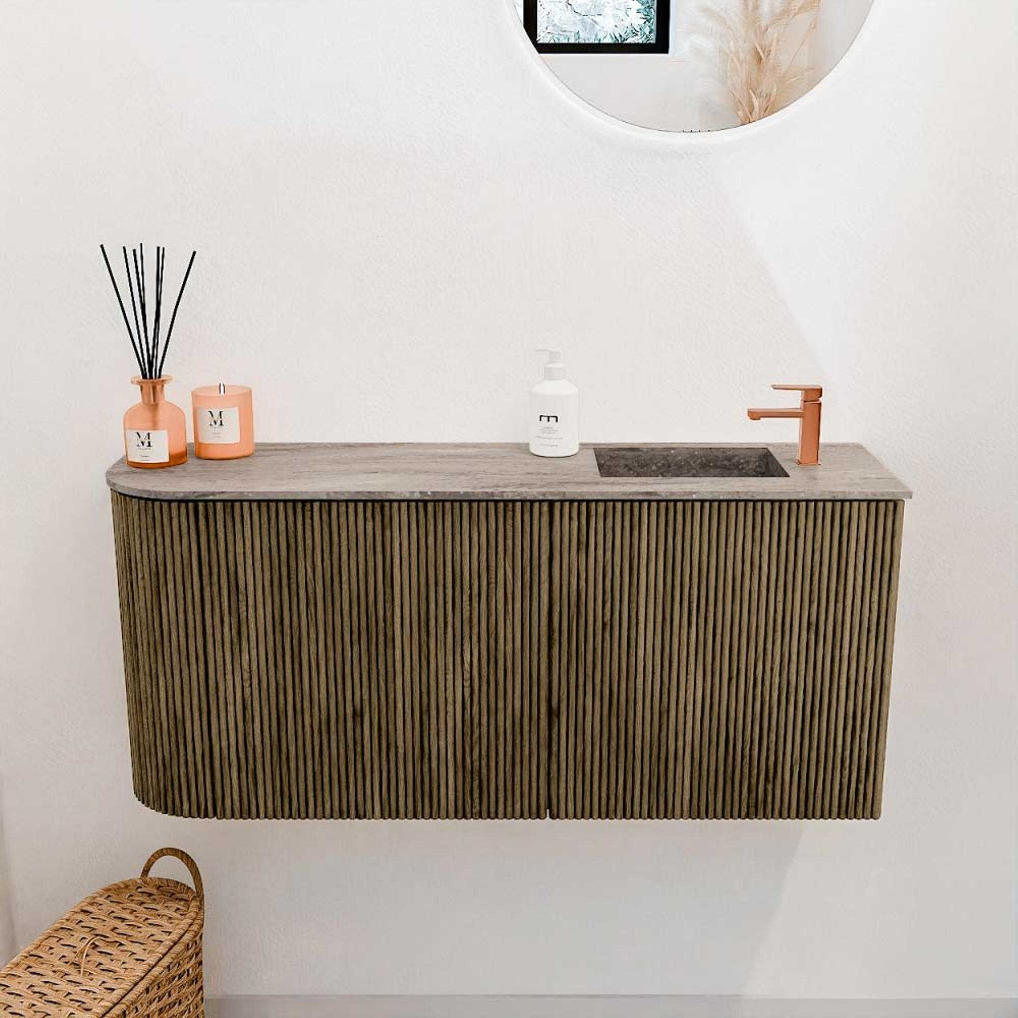 De combinatie van massief eikenhout met een subtiele, verticale ribstructuur geeft het meubel een luxe en tijdloze uitstraling. De kleur Dusk voegt een warme, natuurlijke tint toe die moeiteloos aansluit bij verschillende badkamerstijlen, van modern tot klassiek. Dit meubel is een echte blikvanger die jouw badkamer direct een upgrade geeft. Door de ronde vorm aan de linkerkant krijgt het geheel een zachte, uitnodigende uitstraling die het design uniek maakt. Zo geniet je niet alleen van functionaliteit, maar ook van een meubel dat je badkamer echt afmaakt.