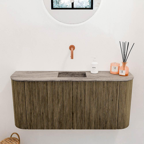 Het meubel valt direct op door zijn verfijnde rondingen aan beide kanten, die het geheel een zachte en uitnodigende uitstraling geven. De kleur Dusk is een subtiele, donkere tint die warmte en rust uitstraalt, waardoor je badkamer een serene sfeer krijgt. Dit design is niet alleen mooi om te zien, maar ook tijdloos, zodat je jarenlang kunt genieten van een badkamer die nooit uit de mode raakt. Door het strakke lijnenspel en de hoogwaardige afwerking straalt het meubel pure klasse uit, wat jouw badkamer een luxe uitstraling geeft zonder overdadig te zijn.