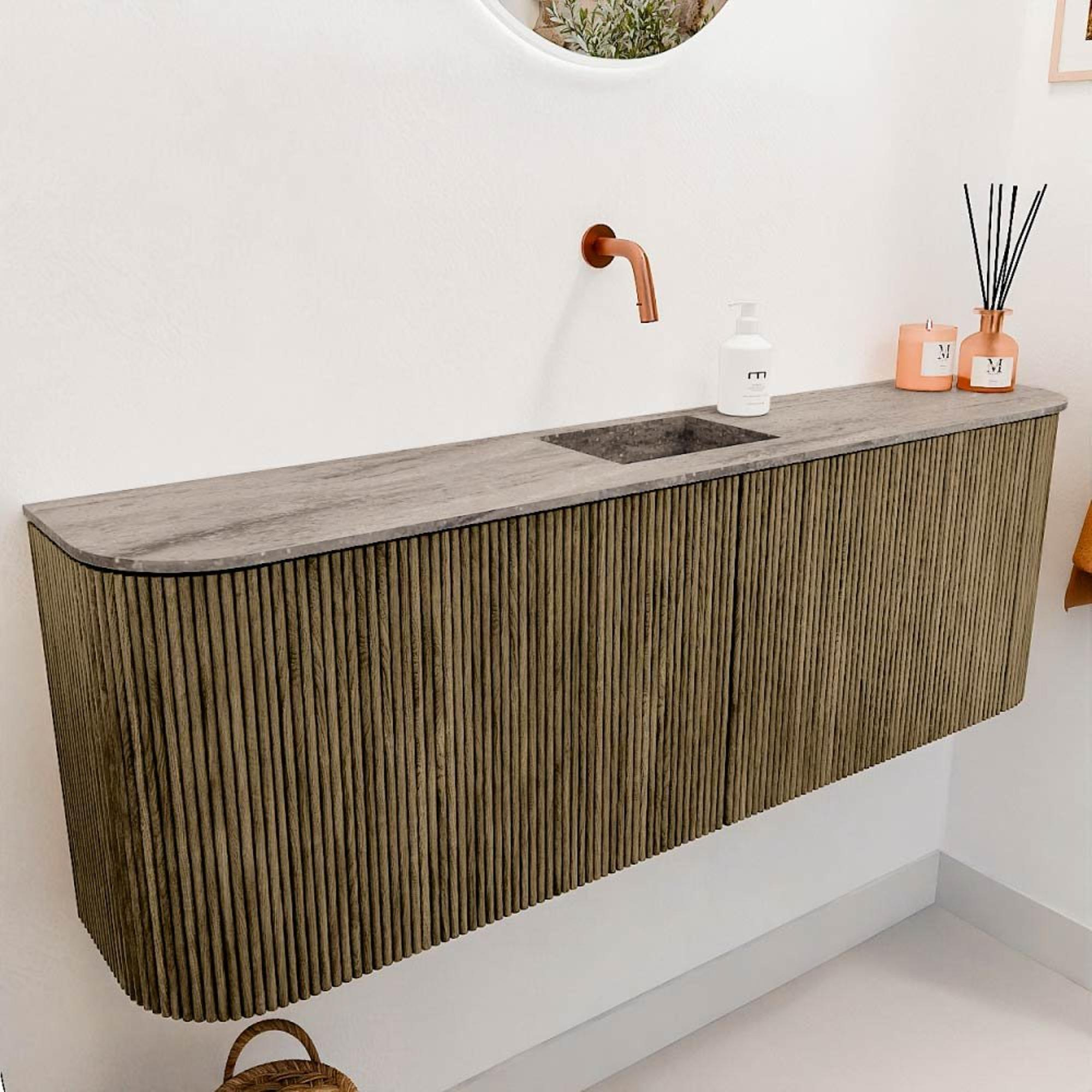 De combinatie van een warme Dusk-kleur met de natuurlijke uitstraling van massief eikenhout aan de voorkant en eikenfineer aan de zijkanten maakt dit meubel tot een echte blikvanger. De subtiele rondingen aan de linker- en rechterzijde zorgen voor een zacht en modern design dat moeiteloos aansluit bij diverse badkamerstijlen. Dit stijlvolle meubel geeft jouw badkamer een luxe uitstraling zonder te overheersen, waardoor het een tijdloze toevoeging is die jarenlang meegaat.