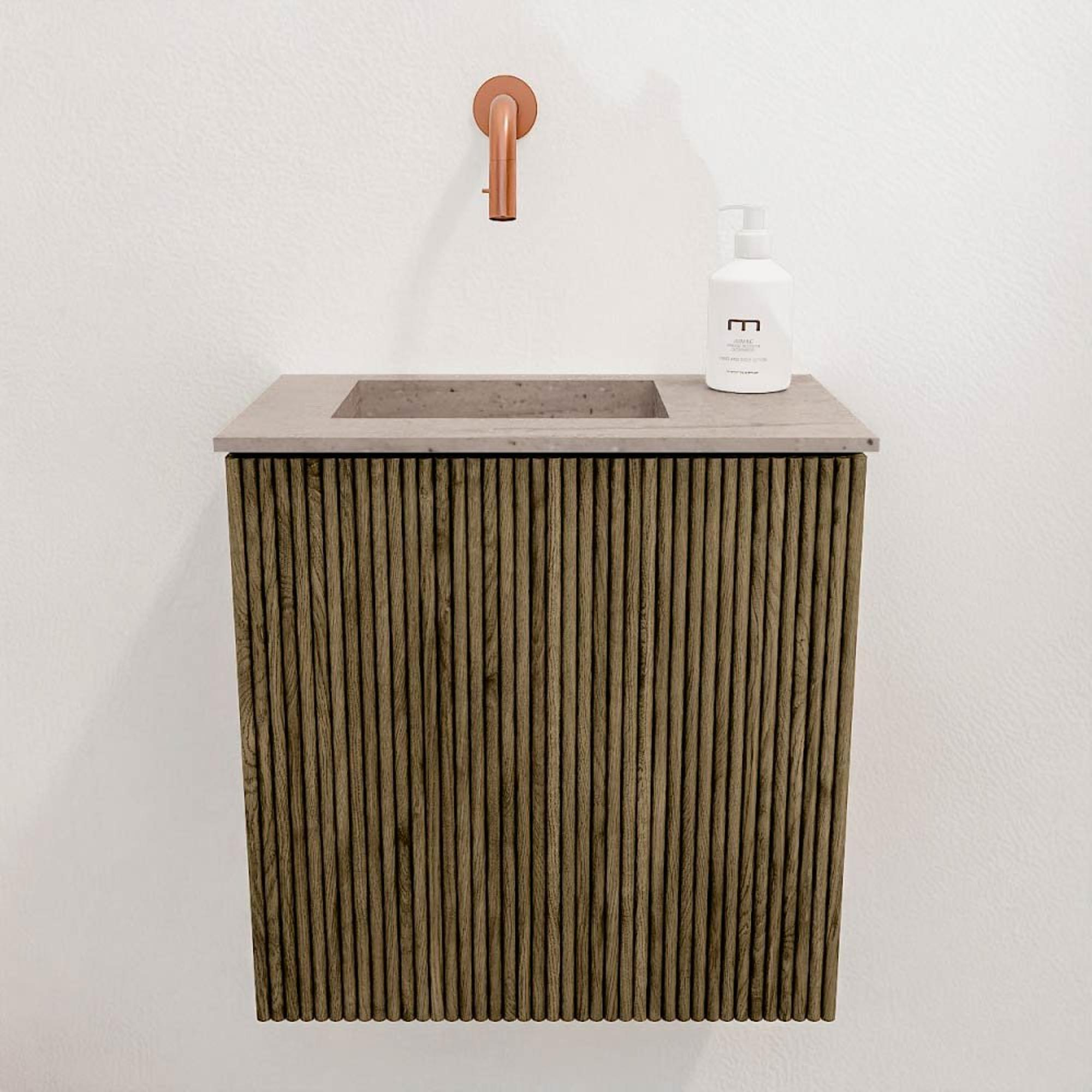 De combinatie van massief eikenhout aan de voorkant en eikenfineer aan de zijkanten zorgt voor een tijdloze en natuurlijke uitstraling. De kleur Dusk voegt een warme, subtiele tint toe die rust en elegantie uitstraalt. De verticale groeven in het design geven het meubel een uniek karakter en maken het een echte blikvanger in jouw badkamer. Door deze stijlvolle details voelt jouw badkamer direct luxer en verzorgder aan, zonder dat het te overheersend wordt.