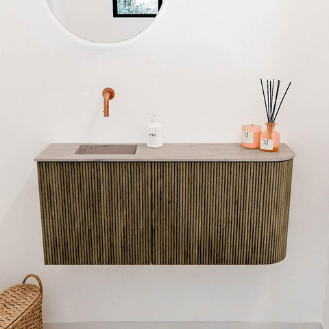 Het meubel valt direct op door zijn moderne en verfijnde uitstraling. De verticale groeven in het hout geven het een eigentijdse en chique look, terwijl de kleur Dusk een warme en natuurlijke sfeer toevoegt. Door de subtiele ronding aan de rechterkant krijgt het meubel een uniek karakter dat je badkamer net dat beetje extra geeft. Dit maakt het niet alleen een functioneel element, maar ook een stijlvol pronkstuk dat naadloos aansluit bij diverse interieurstijlen. Zo creëer je eenvoudig een badkamer die zowel tijdloos als trendy oogt.