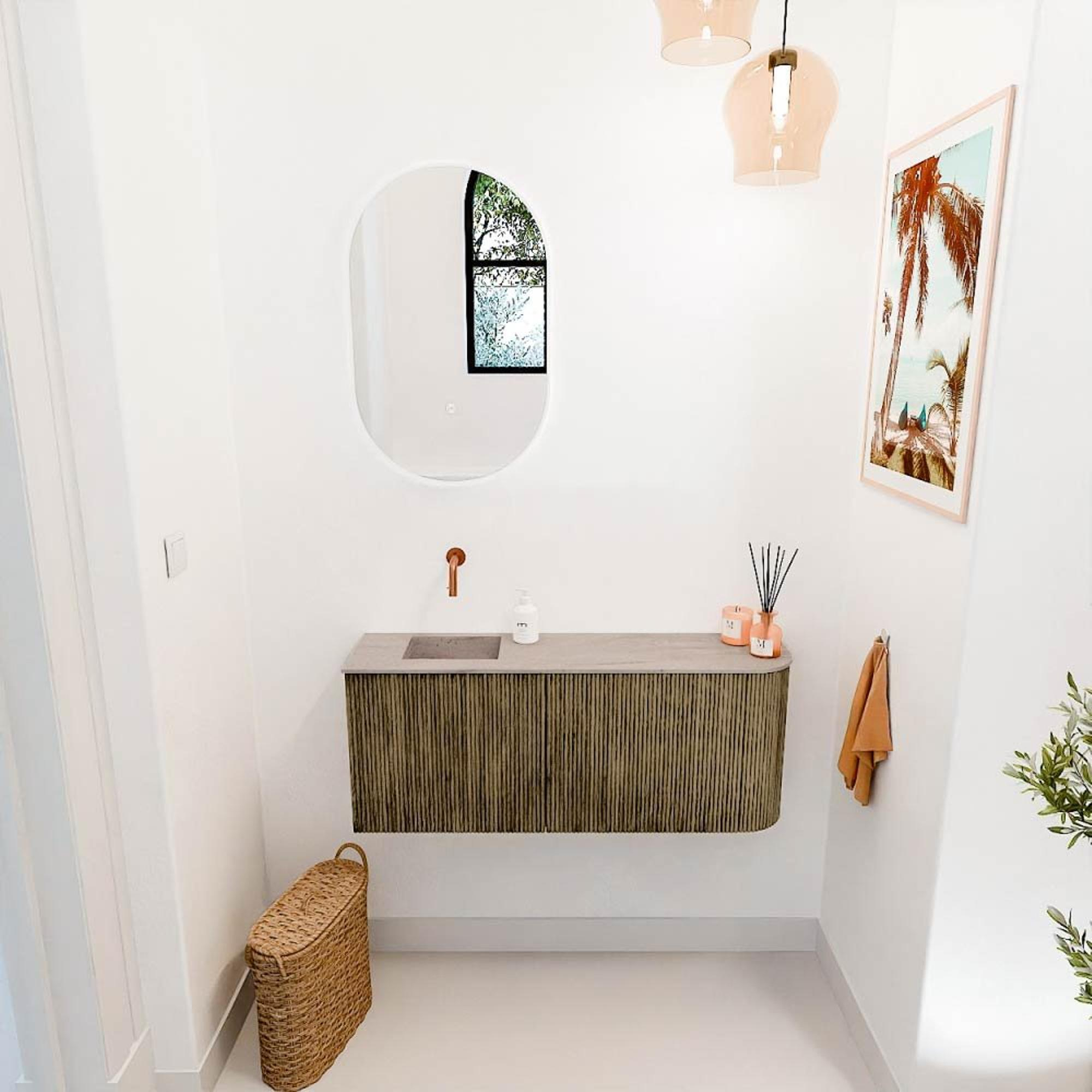Dit meubel valt direct op door zijn elegante uitstraling en verfijnde details. De verticale groeven in het front geven het een unieke textuur en een premium uitstraling die je niet snel ergens anders vindt. De kleur Dusk, een warme, natuurlijke tint, past moeiteloos in diverse interieurstijlen, van modern tot klassiek. Dankzij het subtiele rondingsontwerp aan de rechterkant krijgt het meubel een speelse doch verfijnde look die jouw badkamer net dat beetje extra geeft. Zo creëer je een ruimte die niet alleen functioneel is, maar ook uitnodigt om te ontspannen en te genieten.