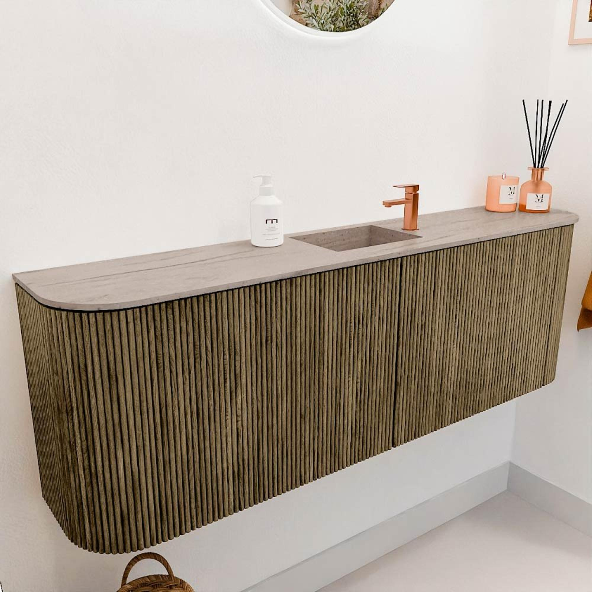 Het meubel valt direct op door zijn verfijnde design met een warme kleurstelling in Dusk en een wastafel in de kleur Saba. De afgeronde zijkanten geven het meubel een zachte, organische uitstraling die het geheel een moderne en toch tijdloze look geeft. Verticale ribben op de fronten voegen een subtiel maar krachtig detail toe, waardoor het meubel een luxe en exclusieve uitstraling krijgt. Dit maakt het niet alleen een functioneel element, maar ook een stijlvol pronkstuk in jouw badkamer. Met dit meubel haal je een designstuk in huis dat perfect aansluit bij diverse interieurstijlen, van modern tot natuurlijk en warm.