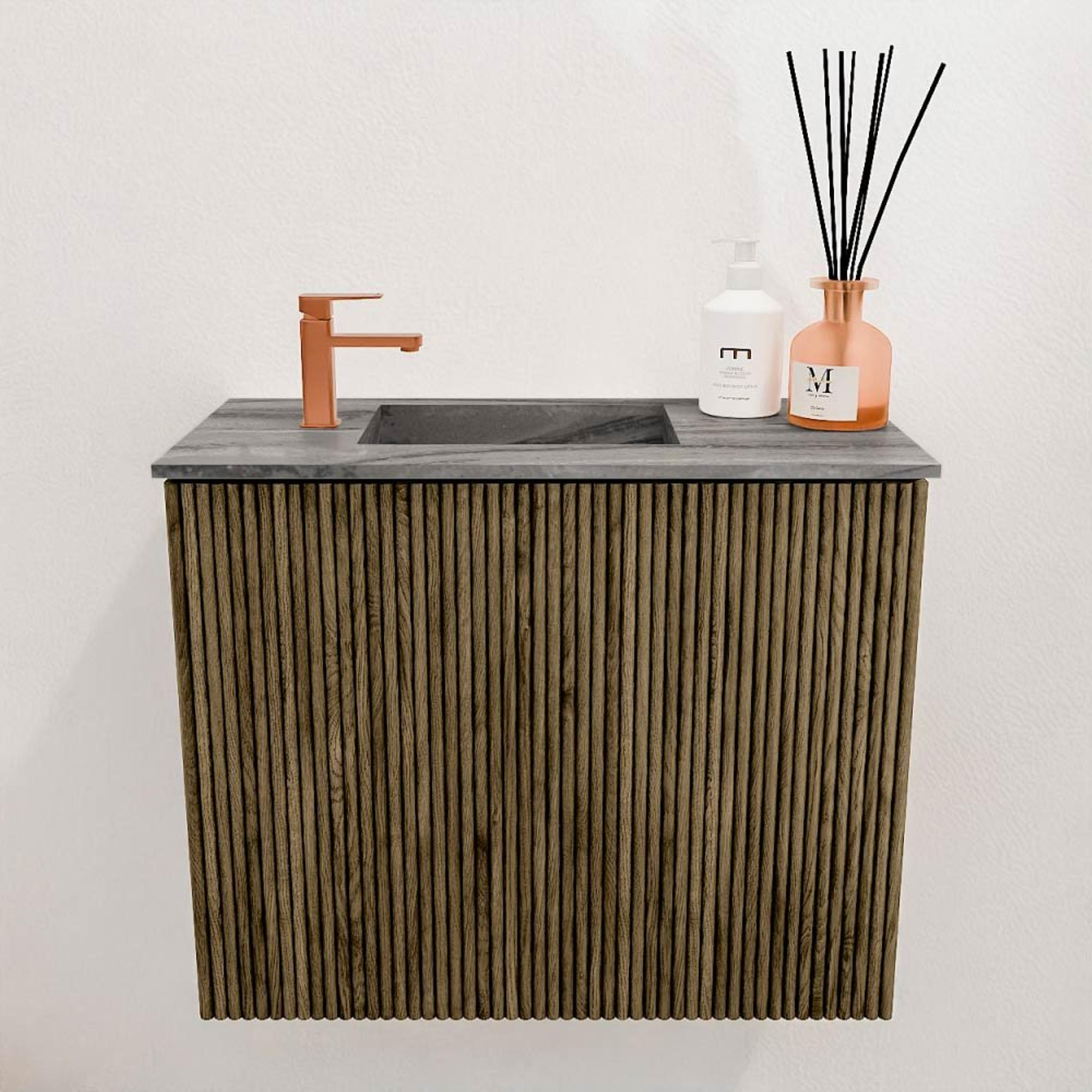 Deze compacte en stijlvolle oplossing brengt een verfijnde sfeer in jouw kleine badkamer of gastentoilet. Met zijn zorgvuldig gekozen materialen en doordachte ontwerp transformeert dit meubel jouw ruimte in een oase van rust en elegantie. Dankzij de combinatie van massief eikenhout en eikenfineer straalt het meubel warmte en natuurlijke klasse uit, terwijl de verticale ribbelstructuur een subtiele textuur toevoegt die het geheel een eigentijdse uitstraling geeft. De wastafel, met een links geplaatste kraangat, is perfect afgestemd op het meubel en in een zachte, donkere kleur uitgevoerd die mooi contrasteert met het hout. Zo geniet je niet alleen van een functioneel meubel, maar ook van een echte blikvanger die jouw badkamer compleet maakt. Dit meubel is ideaal voor wie houdt van een natuurlijke, rustige uitstraling zonder in te leveren op praktische bruikbaarheid.