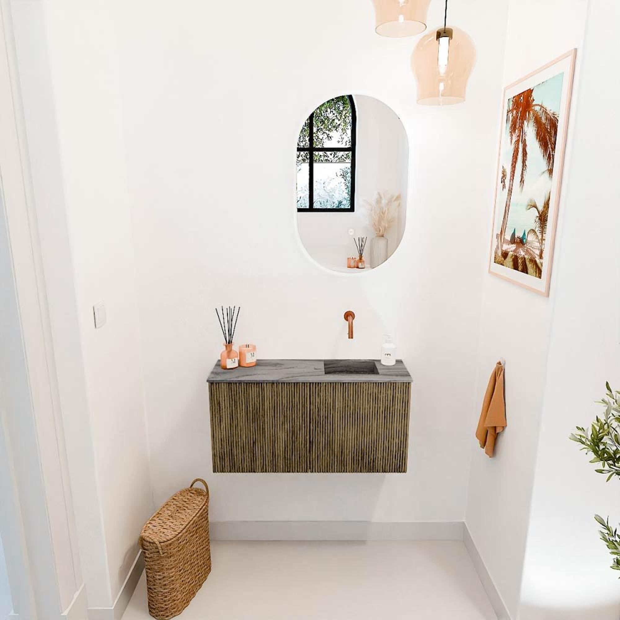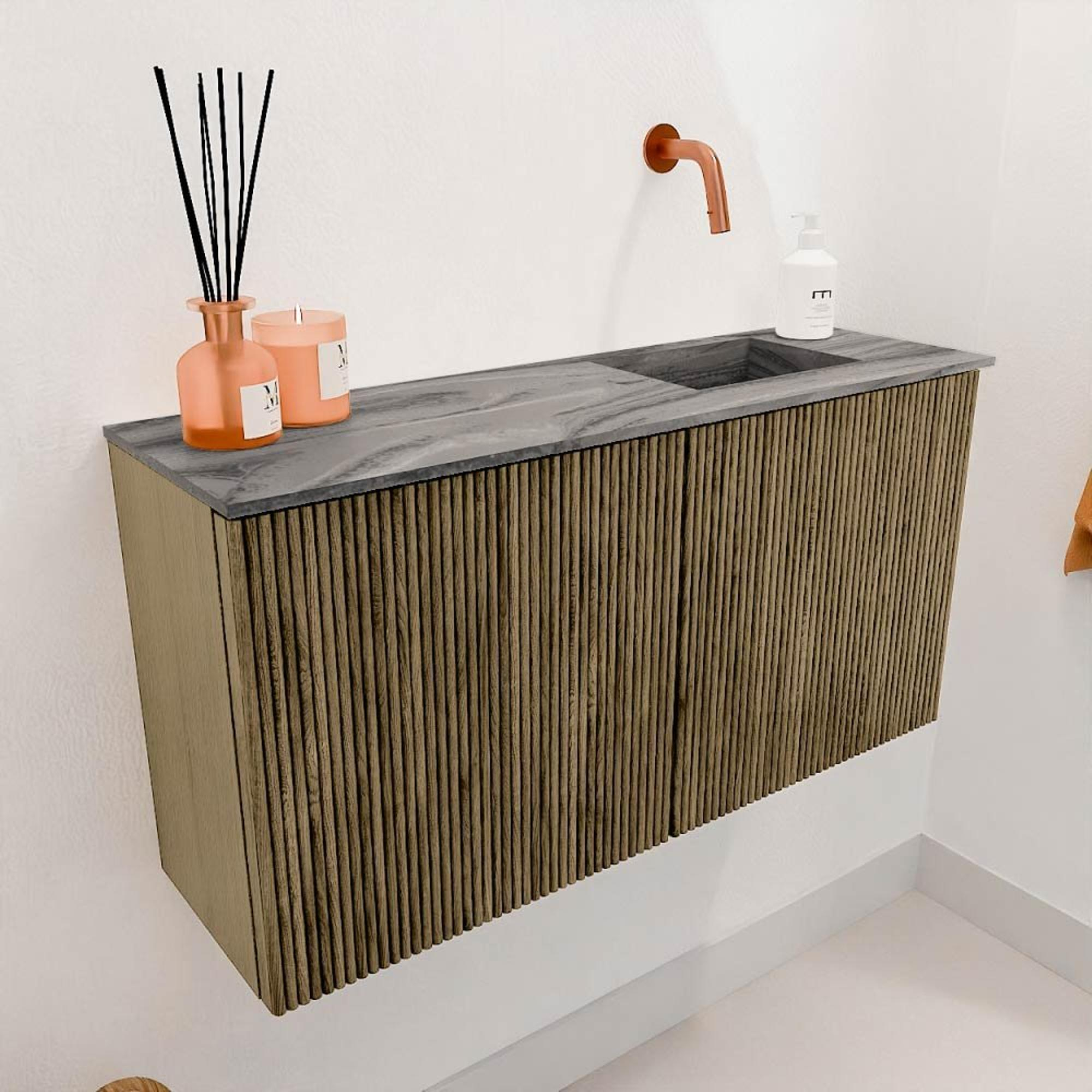 Met dit prachtige meubel geef je jouw badkamer of gastentoilet direct een stijlvolle en warme uitstraling. Het combineert een strak design met natuurlijke materialen, waardoor het een echte blikvanger wordt in elke ruimte. Het meubel is perfect afgestemd op jouw behoefte aan functionaliteit en esthetiek, met een wastafel die rechts gepositioneerd is en zonder kraangat, zodat je zelf de kraan kunt kiezen die het beste bij jouw stijl past. Dankzij de subtiele kleur Dusk ontstaat een rustige sfeer die uitnodigt tot ontspanning. Dit meubel transformeert jouw badkamer in een plek waar je elke dag met plezier begint en eindigt, en waar je gasten zich meteen welkom voelen.