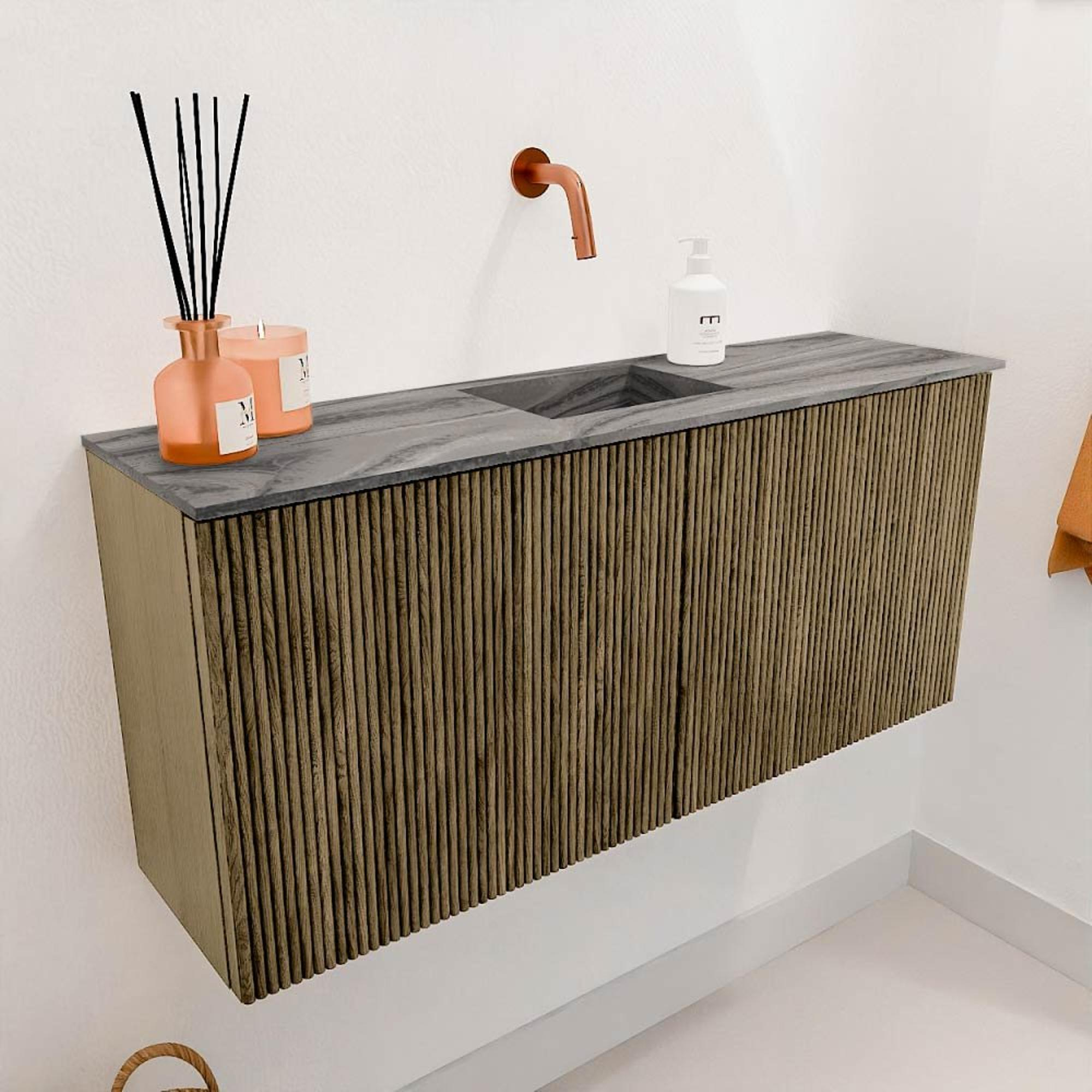 De combinatie van massief eikenhout aan de voorkant en eikenfineer aan de zijkanten geeft het meubel een natuurlijke en luxe uitstraling. De warme kleur Dusk zorgt voor een rustige en uitnodigende sfeer, terwijl de grijze wastafel in Sombra een subtiel contrast biedt dat het geheel een moderne twist geeft. Dit meubel past moeiteloos in zowel klassieke als eigentijdse badkamers. Door de strakke lijnen en het minimalistische design wordt jouw badkamer direct een stuk eleganter en verzorgder. Het is een echte blikvanger die je badkamer een upgrade geeft zonder te overheersen.