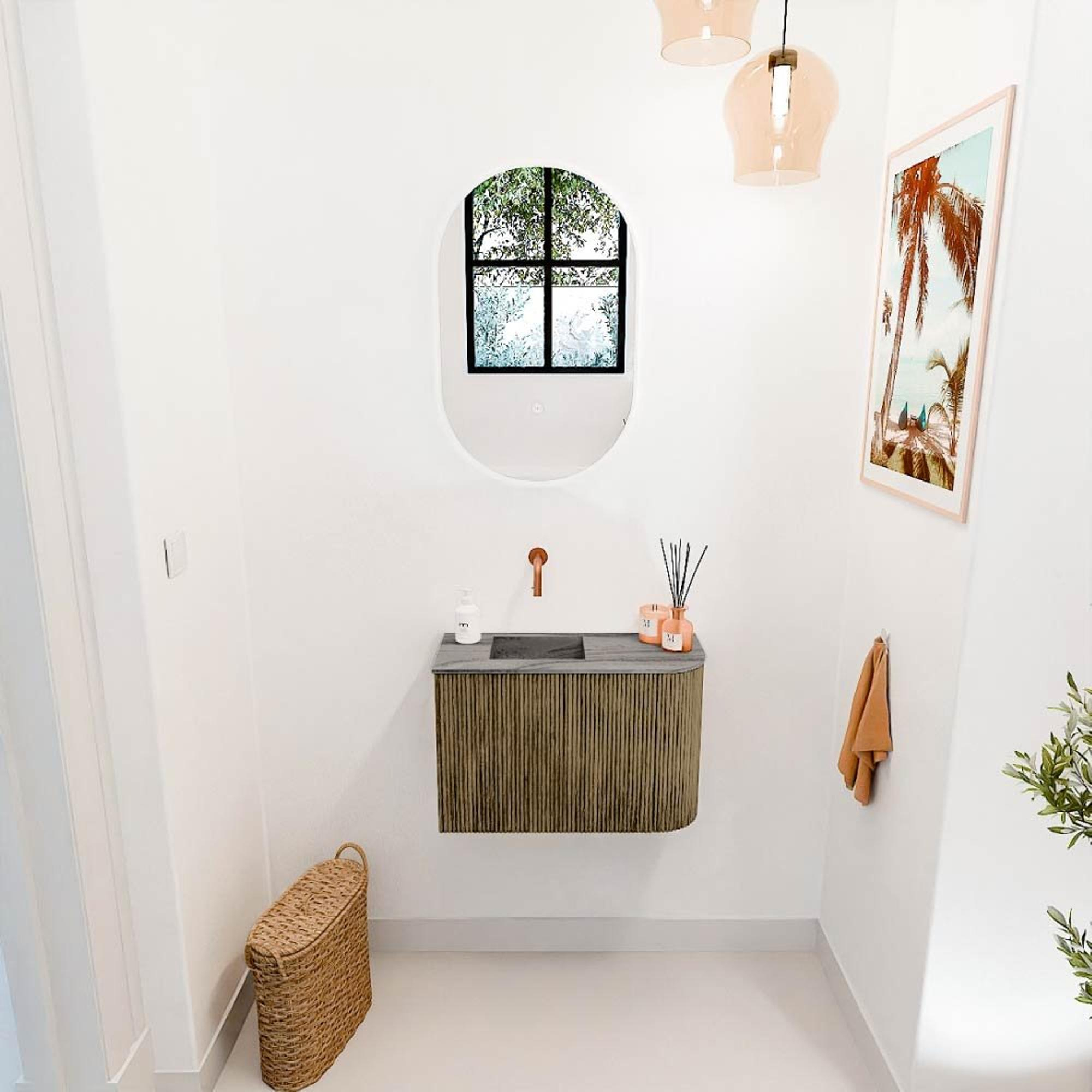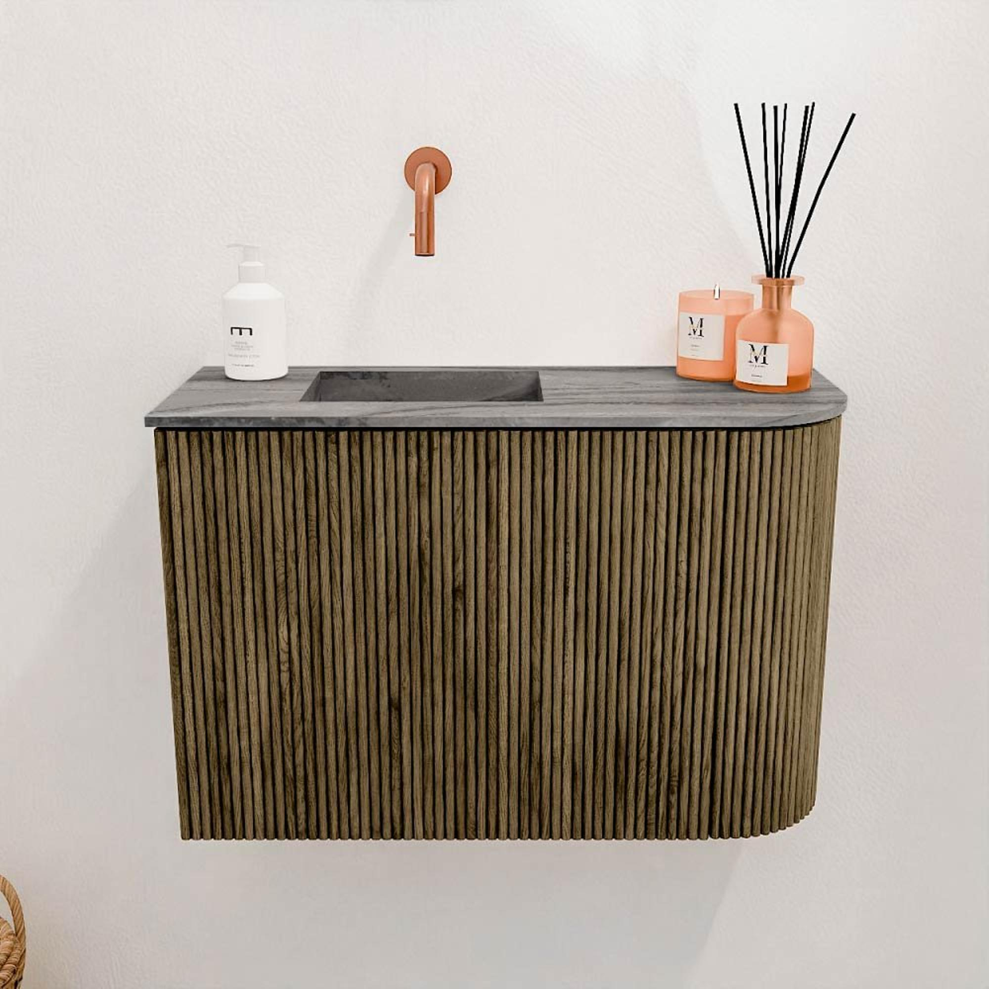 Het meubel valt direct op door zijn elegante vormgeving en de warme kleur Dusk, die een natuurlijke en uitnodigende sfeer creëert. De subtiele ronding aan de rechterkant maakt het ontwerp uniek en zorgt voor een zachte, vloeiende uitstraling. Dit zorgt ervoor dat het meubel naadloos aansluit op verschillende badkamerstijlen, van modern tot tijdloos. De verticale ribbing in het hout voegt een extra dimensie toe, waardoor het meubel niet alleen functioneel is, maar ook een echte blikvanger wordt. Zo geniet je van een toiletmeubel dat niet alleen praktisch is, maar ook jouw persoonlijke stijl versterkt.