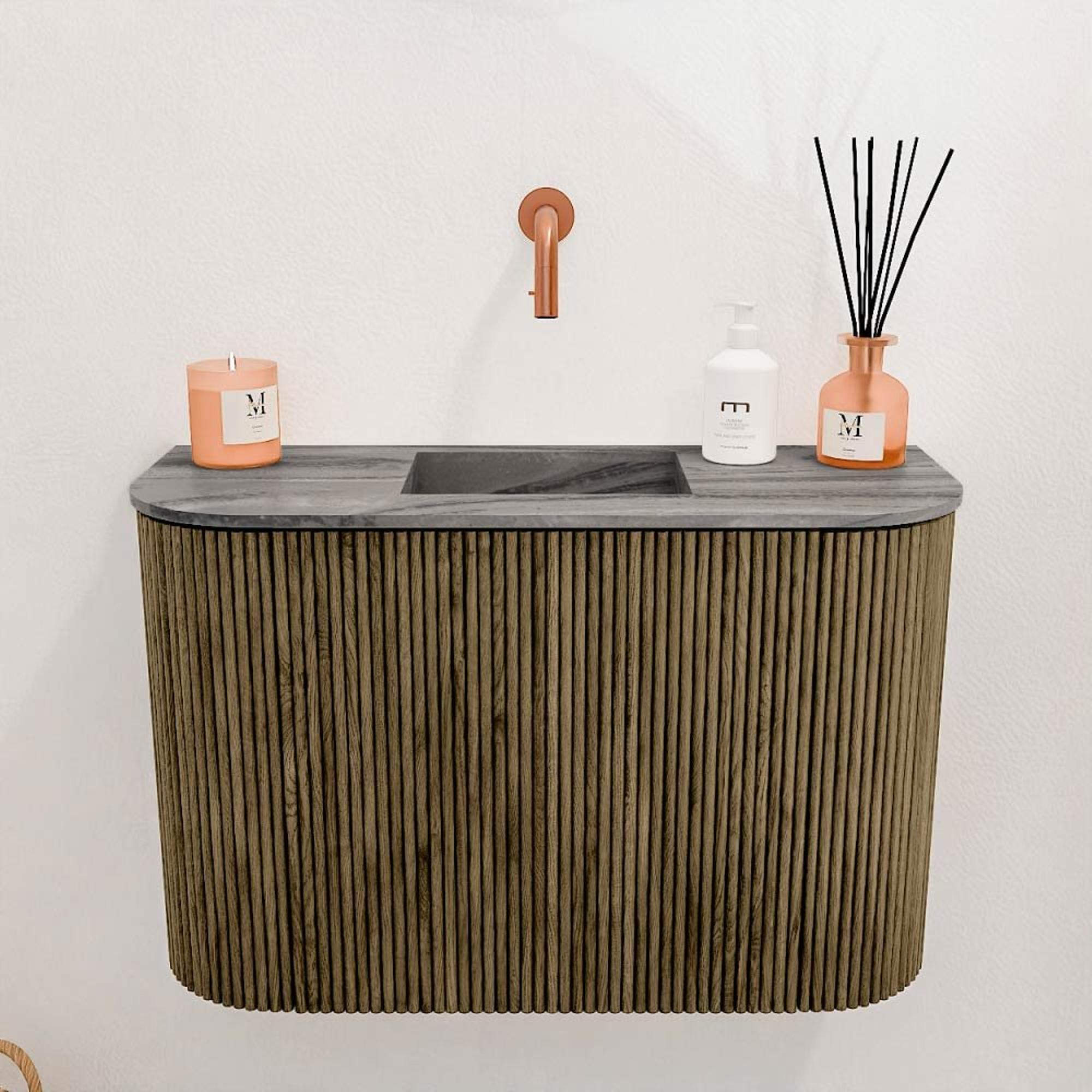 Met dit prachtige meubel geef je jouw badkamer een stijlvolle en warme uitstraling die direct uitnodigt tot ontspanning. Het compacte ontwerp past perfect in kleinere ruimtes, zonder in te leveren op functionaliteit of elegantie. Dankzij de subtiele rondingen aan beide zijden krijgt het meubel een zachte, organische vorm die het geheel een unieke en moderne uitstraling geeft. De combinatie van het warme Dusk-hout en de strakke, grijze wastafel in de kleur Sombra zorgt voor een harmonieus contrast dat je badkamer een luxe en tijdloze sfeer geeft. Dit meubel is niet alleen een lust voor het oog, maar ook bijzonder praktisch dankzij de slimme indeling en het hoogwaardige materiaalgebruik. Zo geniet je elke dag van een opgeruimde en sfeervolle badkamer die helemaal bij jouw stijl past.