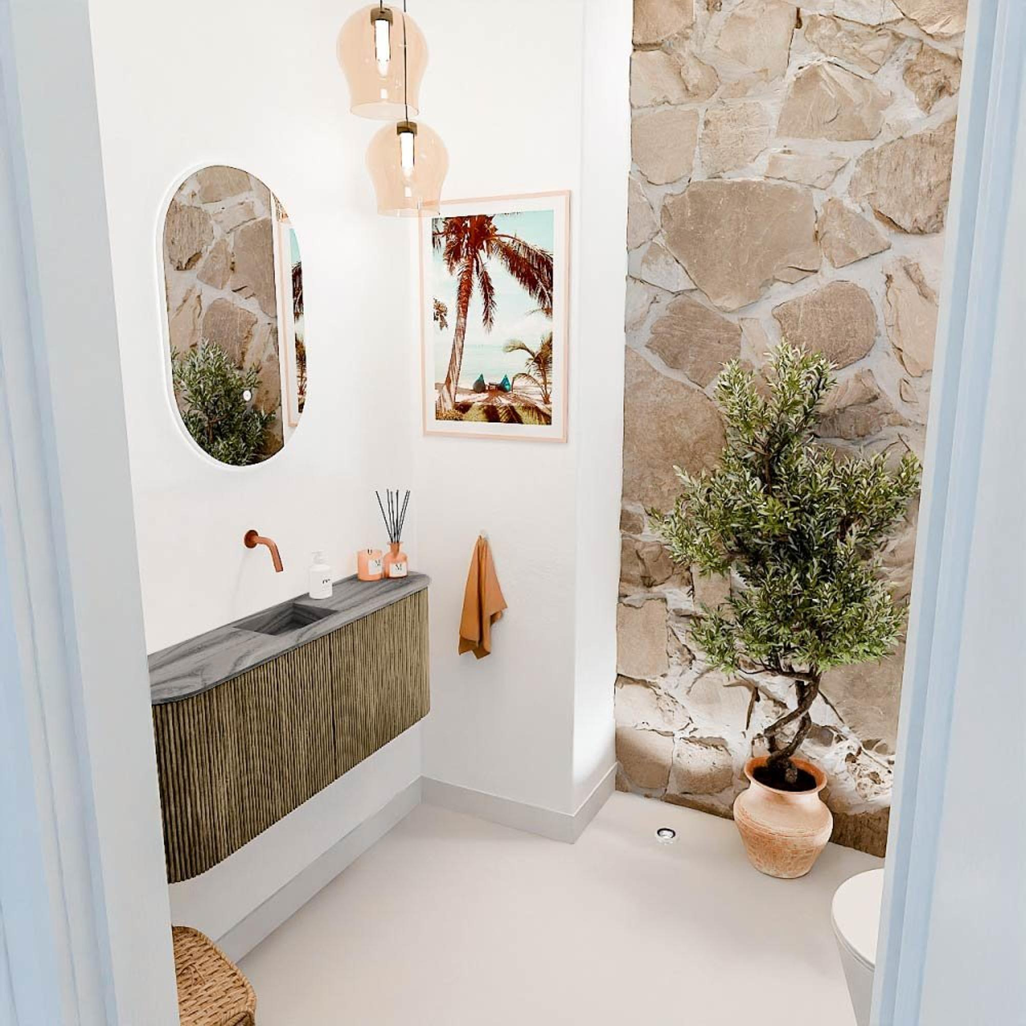 De combinatie van massief eikenhout en eikenfineer in een warme Dusk-kleur geeft dit meubel een tijdloze en natuurlijke uitstraling. De afgeronde hoeken aan beide zijden zorgen voor een zachte, uitnodigende vorm die je badkamer direct een luxe uitstraling geeft. De verticale ribbelstructuur op de fronten voegt een subtiel, maar opvallend detail toe dat het meubel onderscheidt van standaard badkamermeubels. Door deze stijlvolle elementen wordt jouw badkamer een plek waar je met plezier tijd doorbrengt, en die indruk maakt op iedereen die binnenkomt.