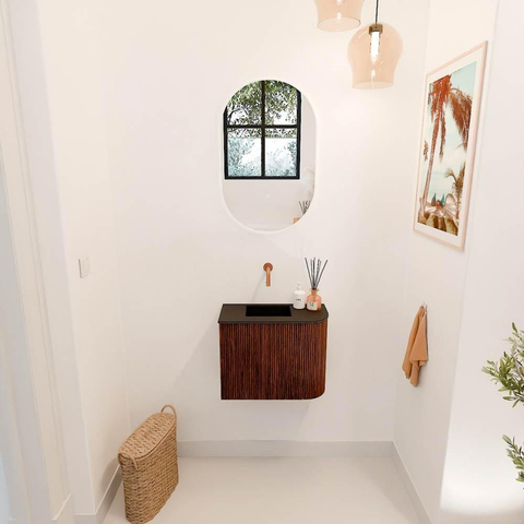 De uitstraling van dit meubel is modern en verfijnd dankzij de verticale ribbels en de warme Ruby-kleur. Het gebruik van massief eikenhout en eikenfineer geeft het geheel een natuurlijke en luxe uitstraling die je badkamer direct een upgrade geeft. Door de subtiele ronding aan de rechterkant oogt het meubel speels en uniek, zonder te overheersen. Zo creëer je een gastvrije sfeer die indruk maakt op je bezoek. Bovendien past het ontwerp perfect in zowel klassieke als eigentijdse interieurs, waardoor je verzekerd bent van een tijdloos meubelstuk.Duurzaam