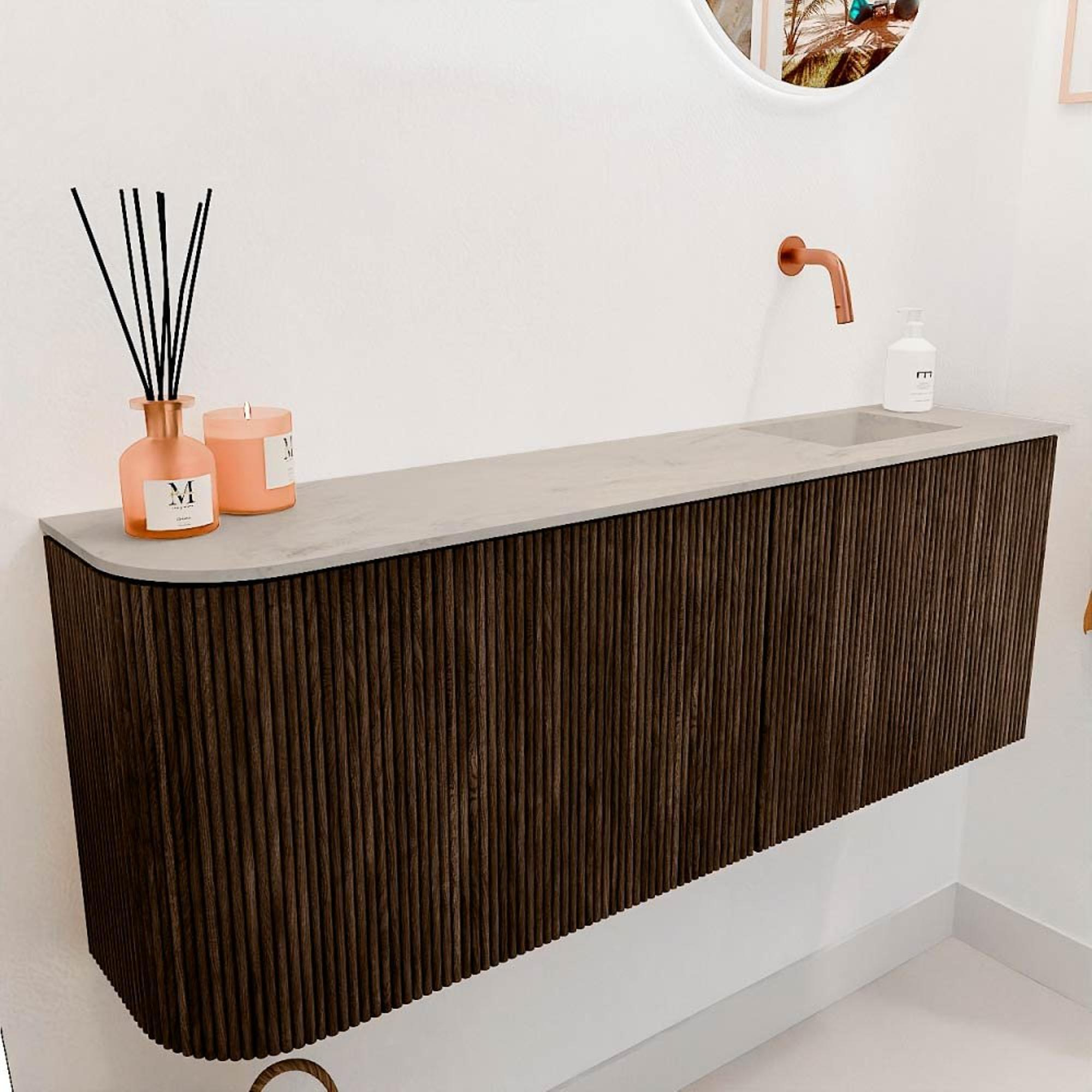 Het meubel valt direct op door zijn verfijnde design met een unieke ronding aan de linkerkant, wat het een speels en toch elegant karakter geeft. De walnootkleur zorgt voor een warme en natuurlijke sfeer, die moeiteloos te combineren is met diverse badkamerstijlen. Dankzij de verticale groeven in het hout krijgt het meubel een subtiele textuur die het geheel nog interessanter maakt. Dit stijlvolle meubel is niet alleen een lust voor het oog, maar tilt ook de uitstraling van je badkamer naar een hoger niveau.