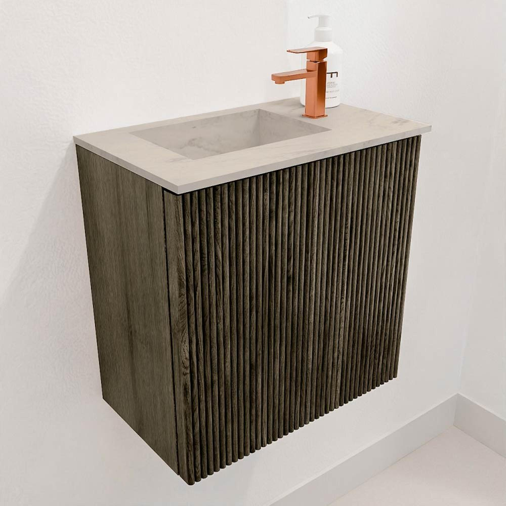 Met dit compacte meubel geef je jouw badkamer een stijlvolle en praktische upgrade. Het combineert een verfijnde uitstraling met slimme functionaliteit, waardoor het perfect is voor kleinere ruimtes waar je toch niet wilt inleveren op design of kwaliteit. De warme, natuurlijke tinten en het subtiele ribbelpatroon op de voorkant zorgen voor een tijdloze sfeer die moeiteloos aansluit bij verschillende interieurstijlen. Dankzij de zorgvuldig gekozen materialen voelt het meubel niet alleen solide aan, maar blijft het ook jarenlang mooi. De wastafel met links geplaatste kraangat maakt het gebruik extra comfortabel en sluit naadloos aan op jouw dagelijkse routine. Zo transformeer je jouw badkamer in een plek waar je elke dag met plezier begint en eindigt.