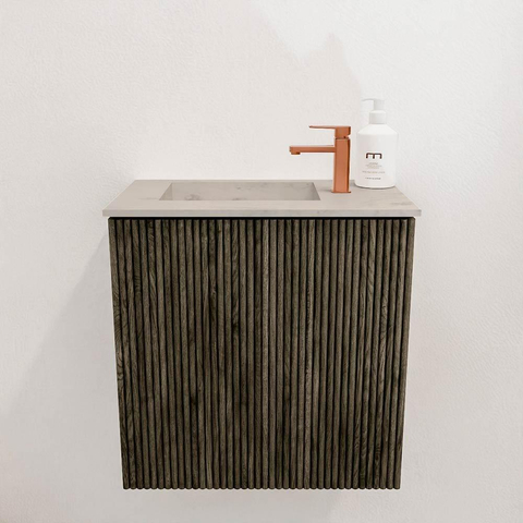 De combinatie van massief eikenhout en eikenfineer geeft dit meubel een natuurlijke en luxe uitstraling. Het verticale ribbelpatroon op de fronten voegt een subtiele textuur toe die direct in het oog springt zonder te overheersen. Door de kleur 'Shadow' krijgt het meubel een moderne, grijze tint die makkelijk te combineren is met verschillende badkamerstijlen. Dit zorgt ervoor dat je badkamer er niet alleen mooi uitziet, maar ook een warme en uitnodigende sfeer krijgt. Zo geniet je elke dag van een stijlvolle omgeving die rust en klasse uitstraalt.