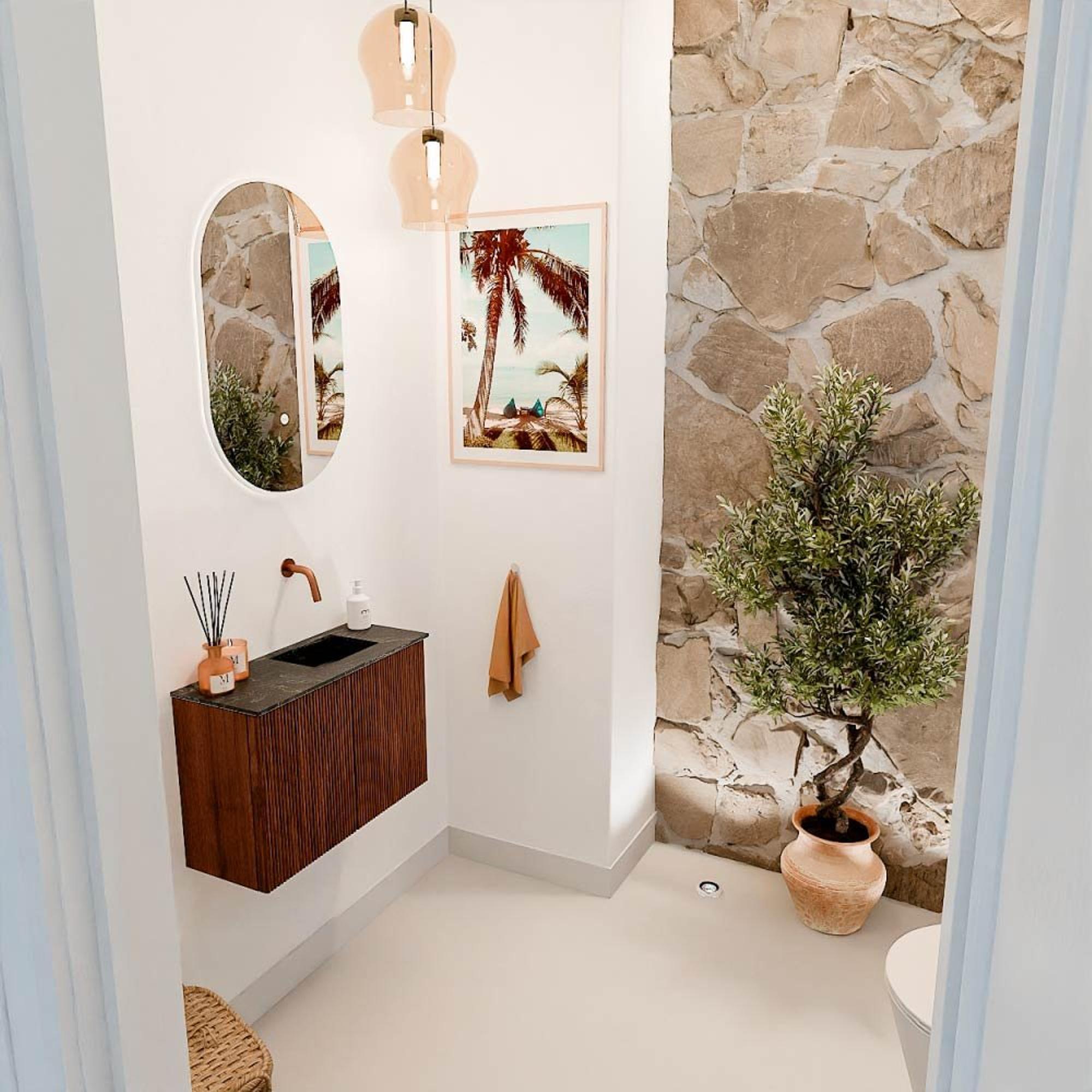 Het meubel valt direct op door de warme, natuurlijke uitstraling van het eikenhout in de kleur Ruby. Deze rijke tint geeft jouw toilet een luxe en uitnodigende sfeer. De lava-kleurige wastafel met een subtiele, rechte positie voegt een modern accent toe zonder afbreuk te doen aan het natuurlijke karakter. Dankzij de strakke lijnen en het doordachte ontwerp past dit meubel perfect in zowel klassieke als eigentijdse interieurs. Met dit meubel haal je een stijlvol pronkstuk in huis dat jouw badkamer of gastentoilet een unieke uitstraling geeft.