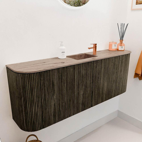 De combinatie van massief eikenhout aan de voorkant en eikenfineer aan de zijkanten in de elegante Shadow-kleur geeft dit meubel een luxe en natuurlijke uitstraling. De verticale groeven zorgen voor een subtiel designaccent dat het meubel een eigentijdse look geeft. Door de afgeronde hoeken oogt het geheel zachter en vriendelijker, wat bijdraagt aan een warme sfeer in je badkamer. Dit meubel is een echte blikvanger die jouw badkamer een exclusieve uitstraling geeft zonder te overheersen.