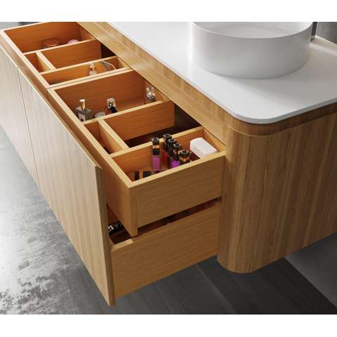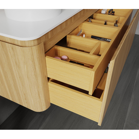 Ruimte en rust in één meubel Met zijn royale breedte van 120 cm en twee ruime softclose-lades biedt dit zwevende meubel volop opbergmogelijkheden. De geïntegreerde grepen zorgen voor een strak geheel zonder zichtbare handvatten. Het topblad is kraangatvrij en dus vrij in te richten met waskommen en kranen die bij jouw badkamer passen. Dankzij de twee sifonuitsparingen is het meubel ideaal voor dubbele opstellingen.