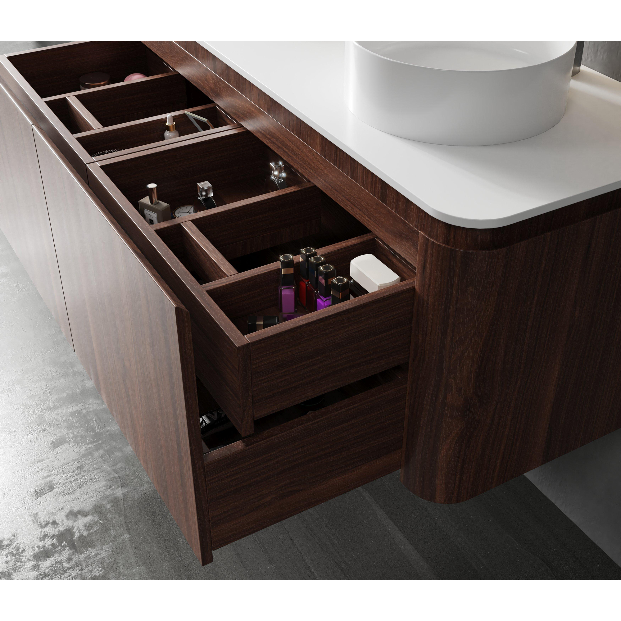 Vrijheid in inrichting en kwaliteit in afwerking Het topblad zonder kraangaten biedt alle vrijheid om je eigen waskommen en kranen te kiezen. De twee sifonuitsparingen maken dit meubel bovendien geschikt voor een dubbele wastafelopstelling. Het duurzame solid surface blad is krasvast, onderhoudsvriendelijk en behoudt zijn elegante uitstraling jarenlang.