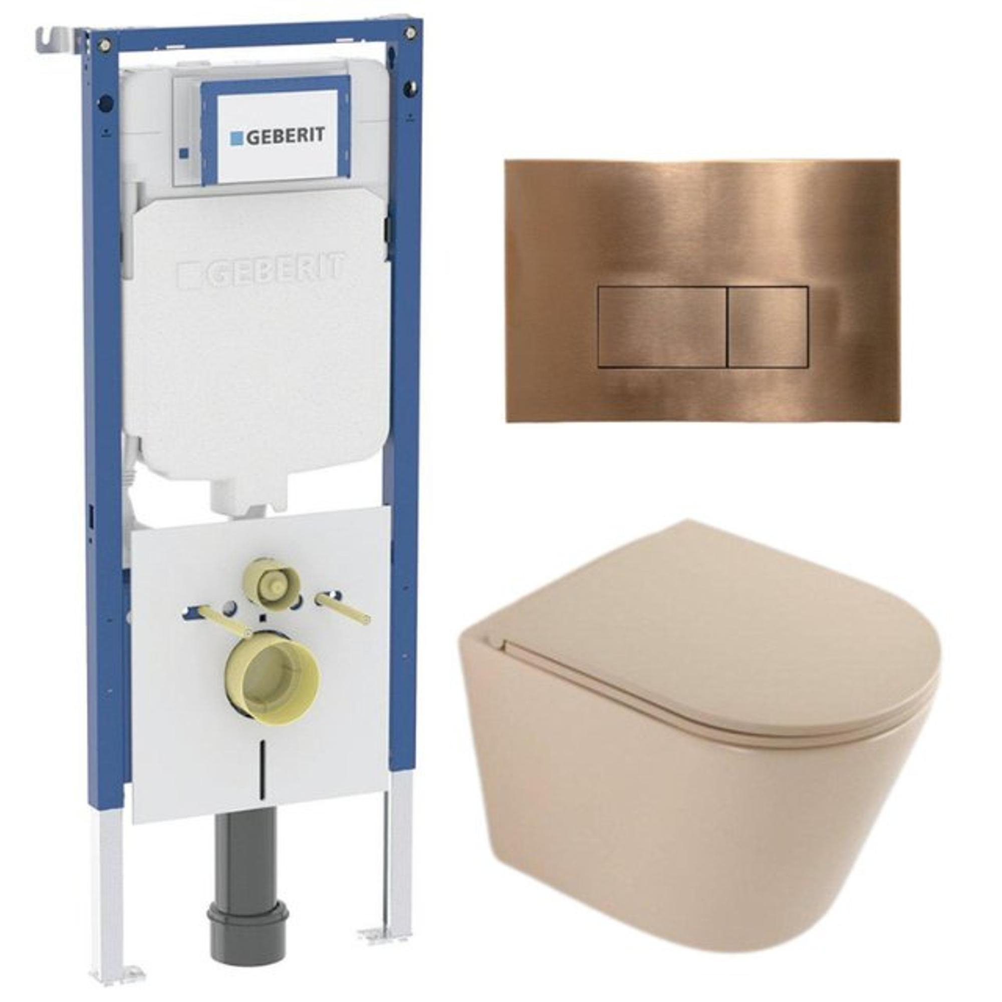 QeramiQ Dely Toiletset - 36.3x51.7cm - diepspoel - rimless - Geberit UP720 inbouwreservoir - softclose toiletzitting - koperen bedieningsplaat - rechtehoekige knoppen - mat beige