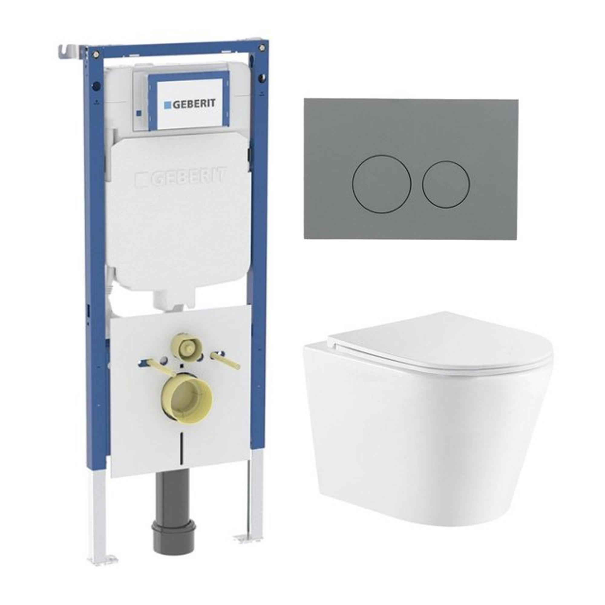 QeramiQ Dely Toiletset - 36.3x51.7cm - diepspoel - rimless - Geberit UP720 inbouwreservoir - softclose toiletzitting - licht grijze bedieningsplaat - ronde knoppen - wit mat