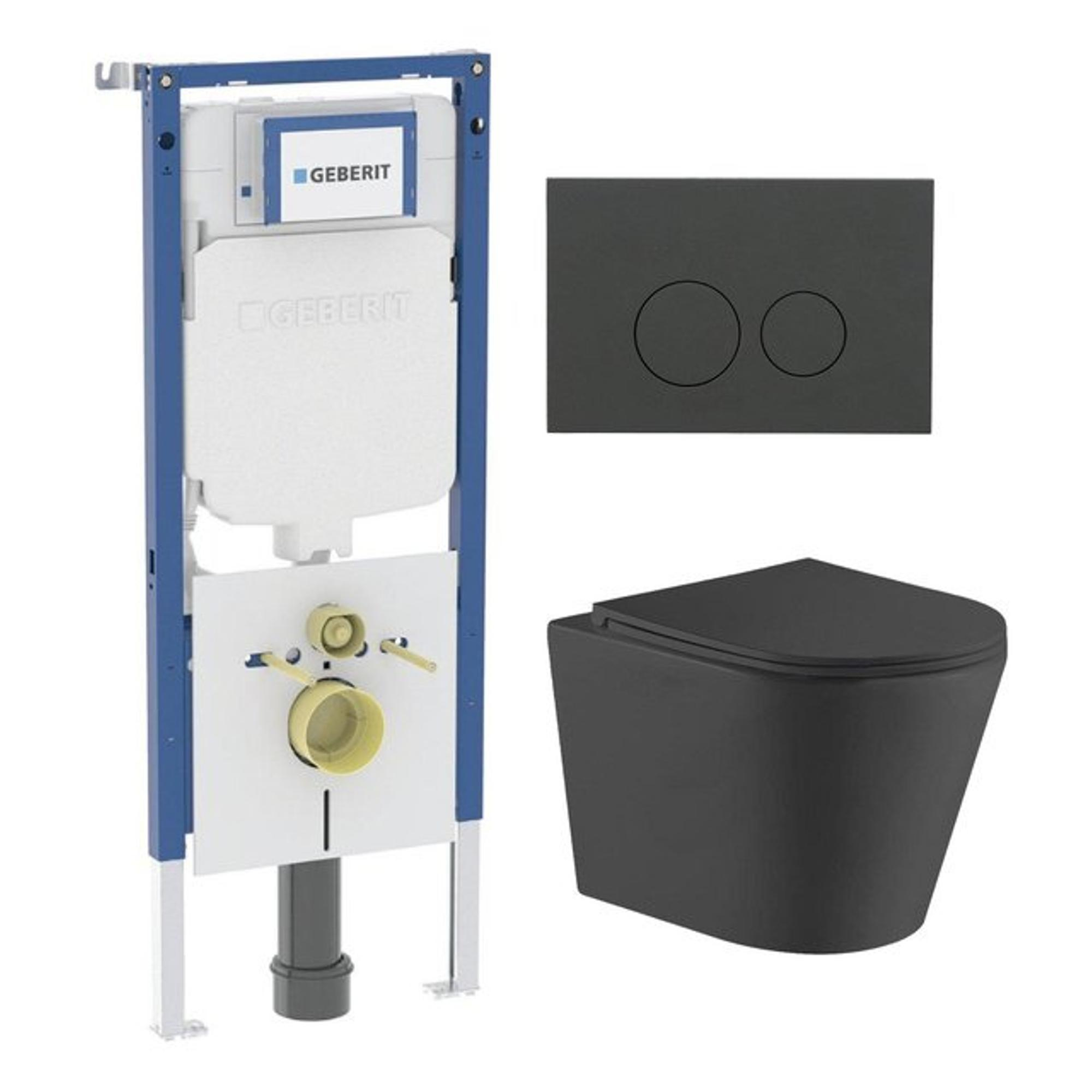 QeramiQ Dely Toiletset - 36.3x51.7cm - diepspoel - rimless - Geberit UP720 inbouwreservoir - softclose toiletzitting - mat antraciet bedieningsplaat - ronde knoppen - zwart mat