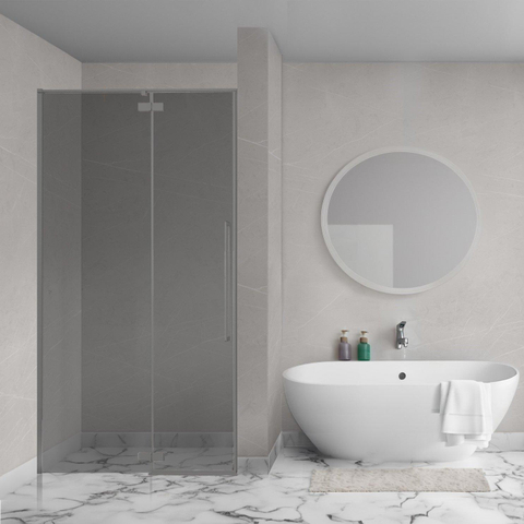 Deze nisdeur valt direct op door zijn elegante rookglas en het gunmetal beslag in antraciet. Het donkere glas geeft je badkamer een luxe en moderne uitstraling, zonder dat het te dominant wordt. Het subtiele kleurcontrast tussen het glas en het beslag zorgt voor een harmonieuze en eigentijdse sfeer. Zo voeg je een stijlvol element toe dat moeiteloos past bij diverse badkamerstijlen, van strak minimalistisch tot industrieel. Met deze deur maak je een bewuste keuze voor design dat zowel tijdloos als trendy is.