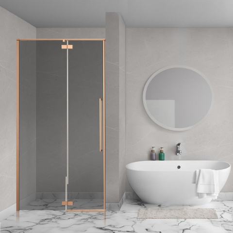 De combinatie van rookglas en geborsteld koperen beslag geeft deze nisdeur een unieke en verfijnde uitstraling. Het rookglas zorgt voor een subtiele, donkere tint die je badkamer een moderne en sfeervolle ambiance geeft. Het geborsteld koper voegt warmte en karakter toe, waardoor het geheel een luxe en exclusieve uitstraling krijgt. Deze stijlvolle deur past perfect in diverse interieurstijlen, van industrieel tot klassiek, en maakt van jouw badkamer een plek waar design en comfort samenkomen.