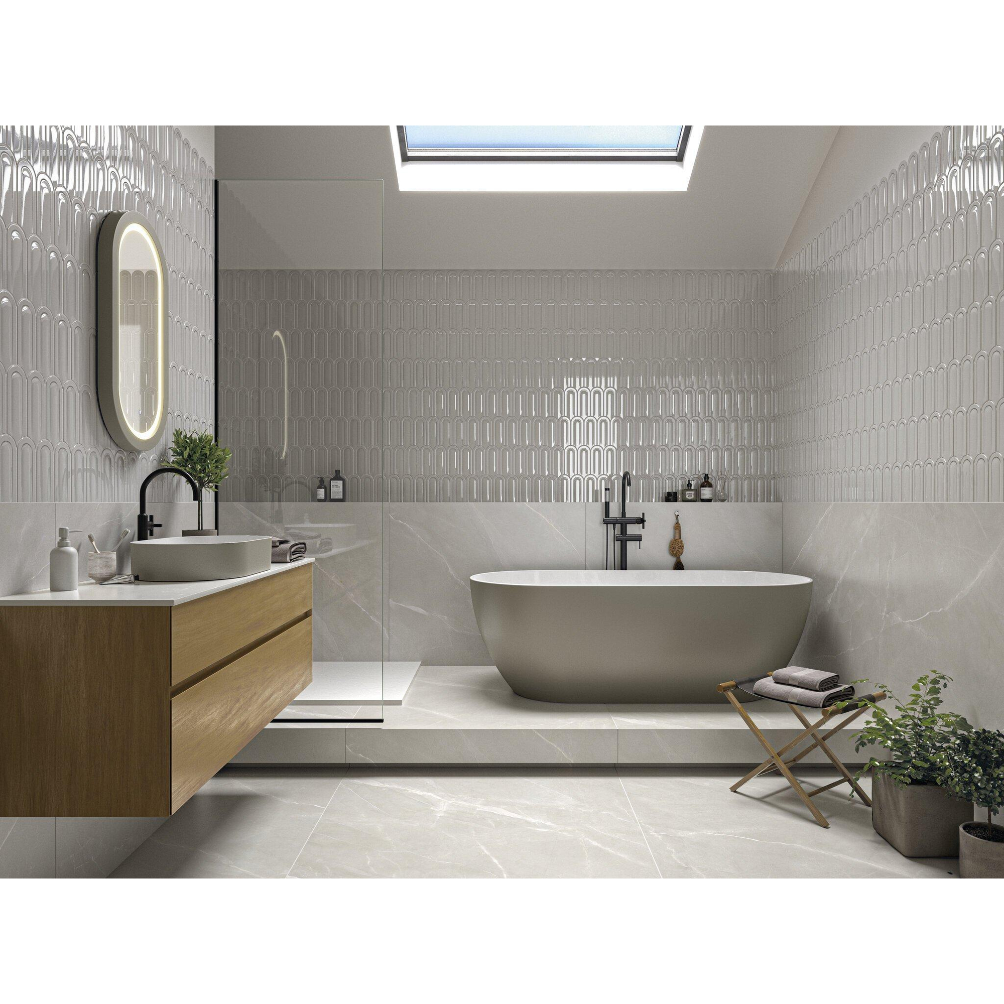 Het slanke formaat van 8x21,5 cm biedt volop ruimte voor creatieve patronen. Leg de tegels in klassiek halfsteensverband voor een rustige, tijdloze uitstraling, of kies voor een stoer visgraatpatroon als eyecatcher achter het bad of de wastafel. Plaats je de tegels verticaal, dan lijken wanden hoger en krijgt je badkamer een moderne, elegante look. Dankzij de lichte kleur kun je spelen met verschillende kleuren voeg: met een witte voeg creëer je een zachte, rustige basis, terwijl een grijze of taupe voeg het patroon juist extra laat spreken. Zo stel je je eigen sfeer samen, van subtiel Scandinavisch tot uitgesproken design, met één en dezelfde tegel.