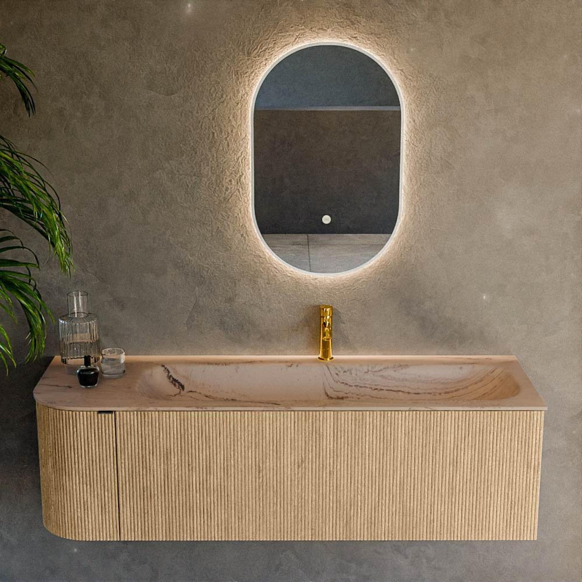 MONDIAZ KURVE-DLUX 145cm badmeubel ronding Links kleur Oak met 1 lade en 1 deur. Wastafel BIG LARGE Rechts 1 kraangat Arena.