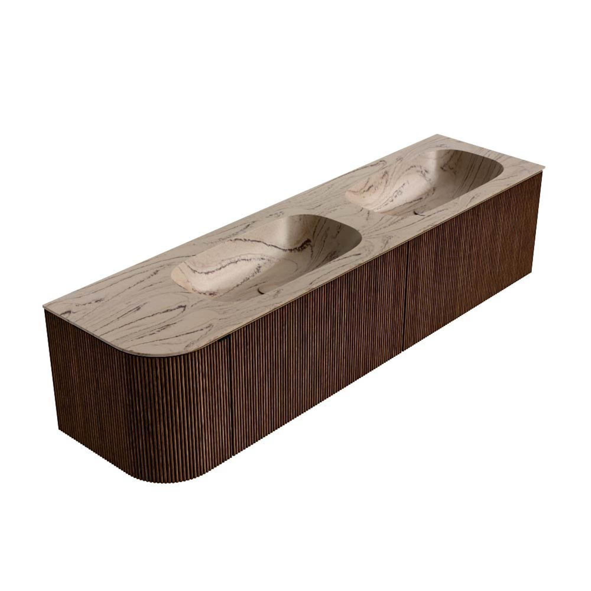 MONDIAZ KURVE-DLUX 175cm badmeubel ronding Links kleur Walnut met 2 lades en 1 deur. Wastafel STOR SMALL Dubbel / Rechts 2 kraangaten Arena.