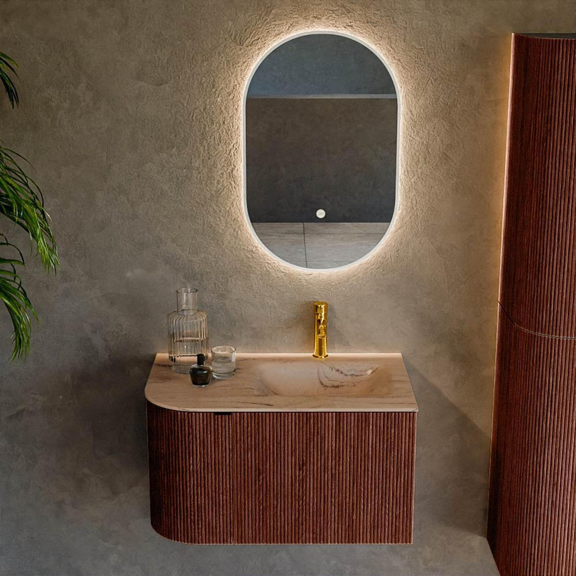 MONDIAZ KURVE-DLUX 75cm badmeubel ronding Links kleur Ruby met 1 lade en 1 deur. Wastafel GRUNNE Rechts 1 kraangat Arena.