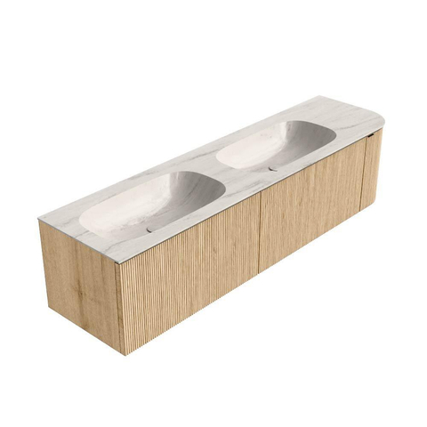 MONDIAZ KURVE-DLUX 175cm badmeubel ronding Rechts kleur Oak met 2 lades en 1 deur. Wastafel STOR SMALL Dubbel / Links 2 kraangaten Meli.
