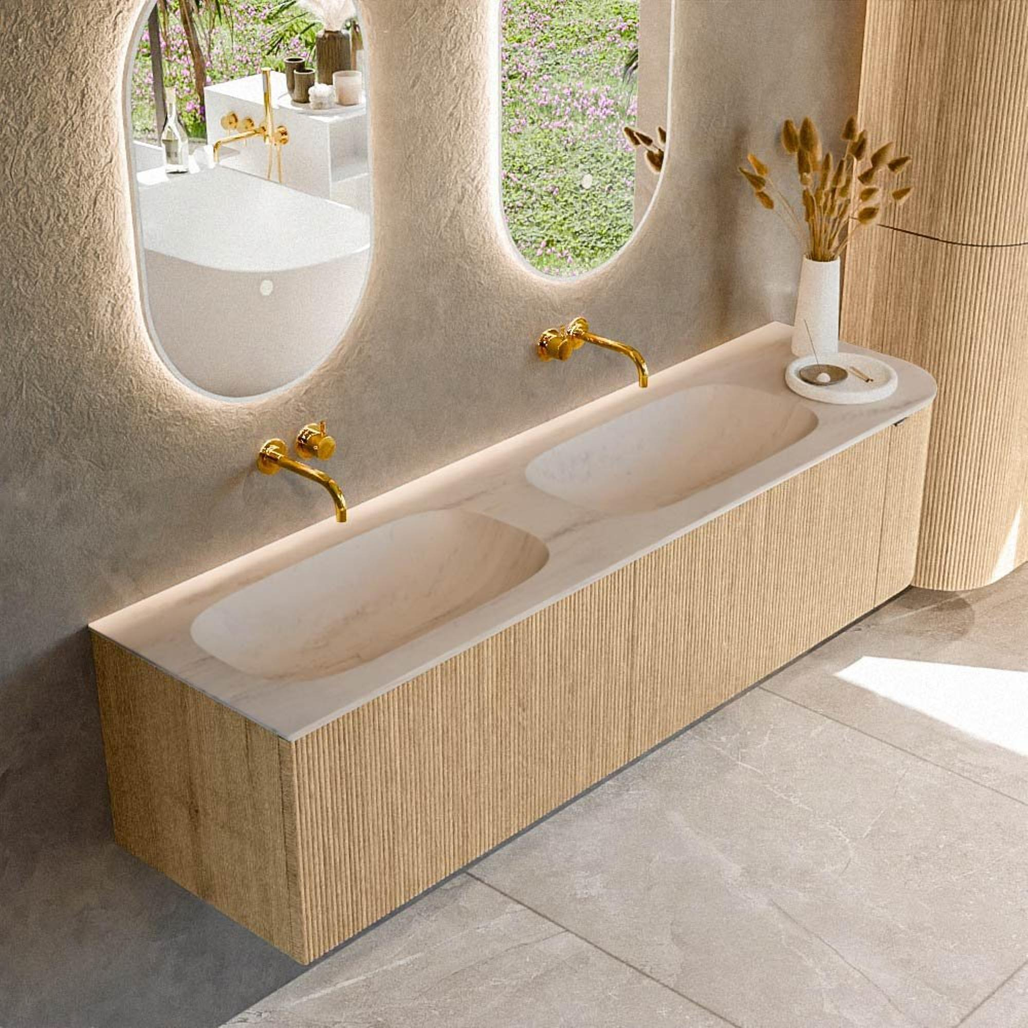 MONDIAZ KURVE-DLUX 175cm badmeubel ronding Rechts kleur Oak met 2 lades en 1 deur. Wastafel STOR SMALL Dubbel / Links zonder kraangat Meli.