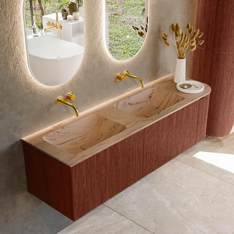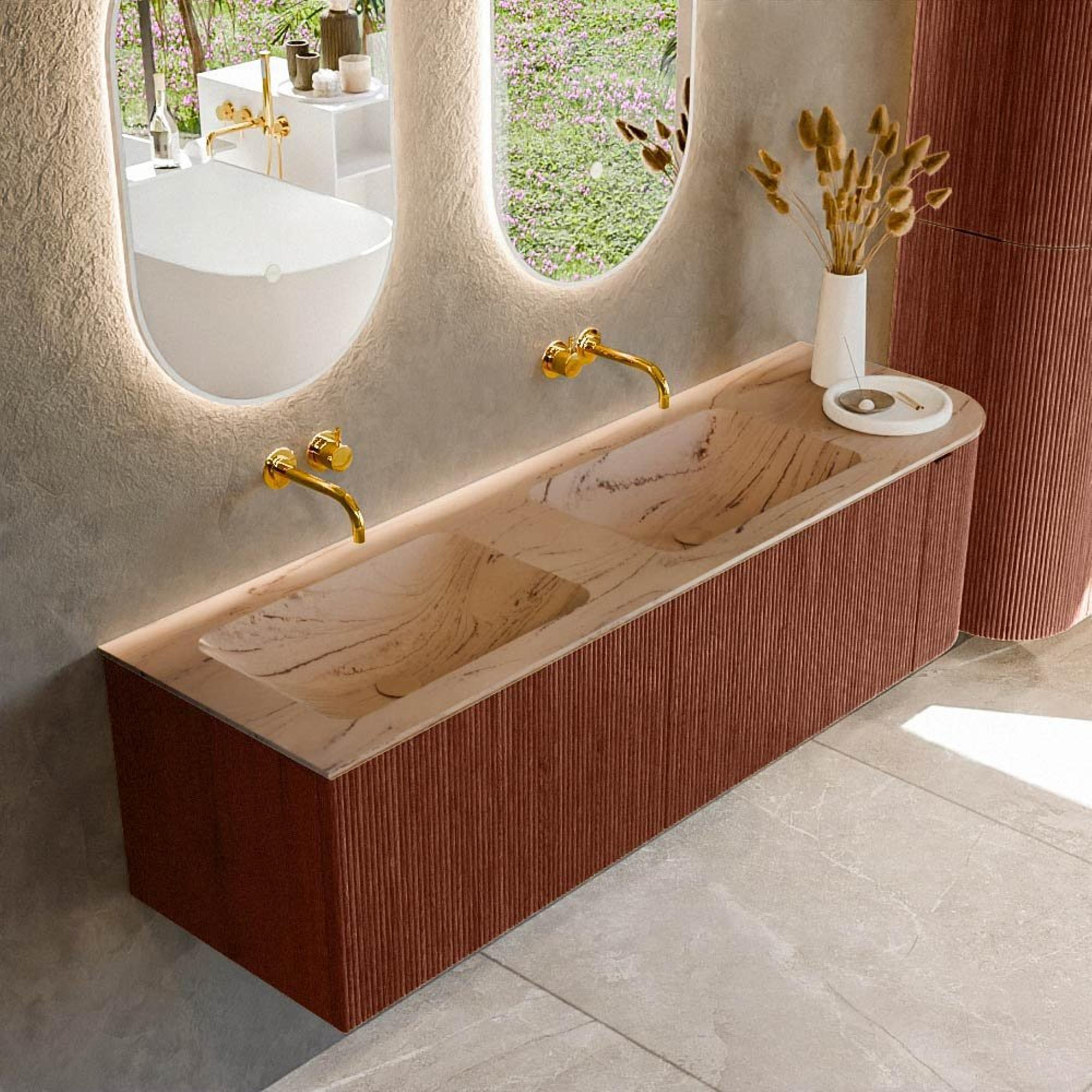 MONDIAZ KURVE-DLUX 155cm badmeubel ronding Rechts kleur Ruby met 2 lades en 1 deur. Wastafel LEAF Dubbel / Links zonder kraangat Arena.